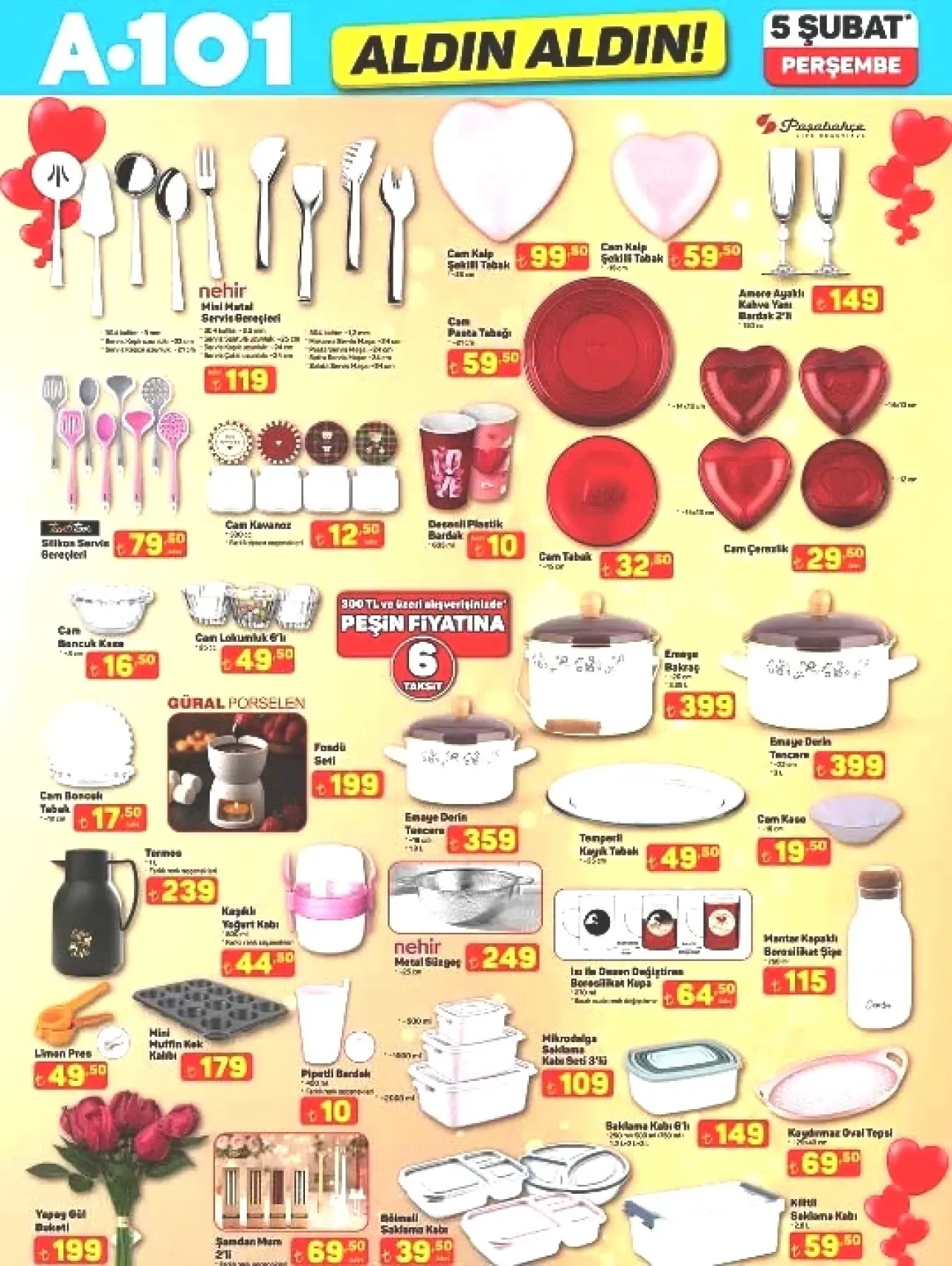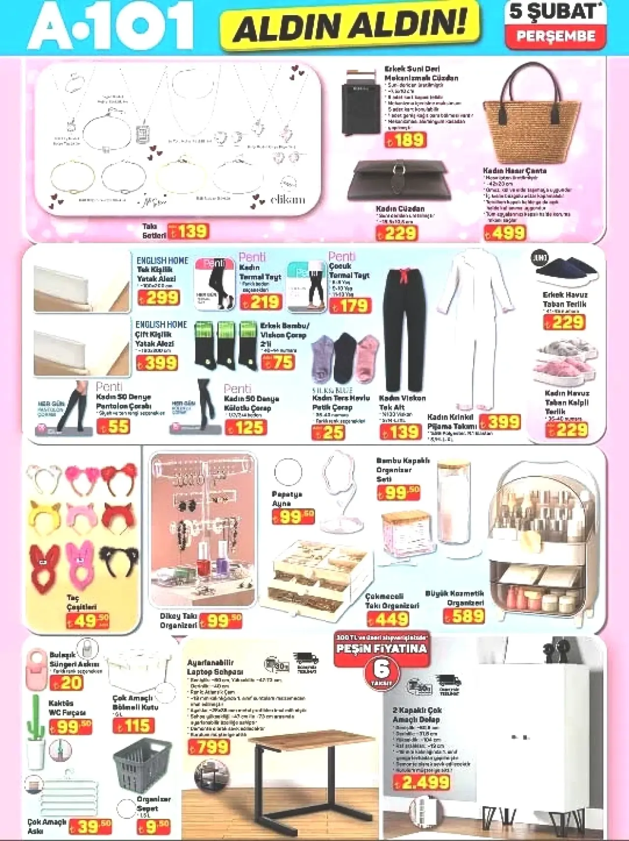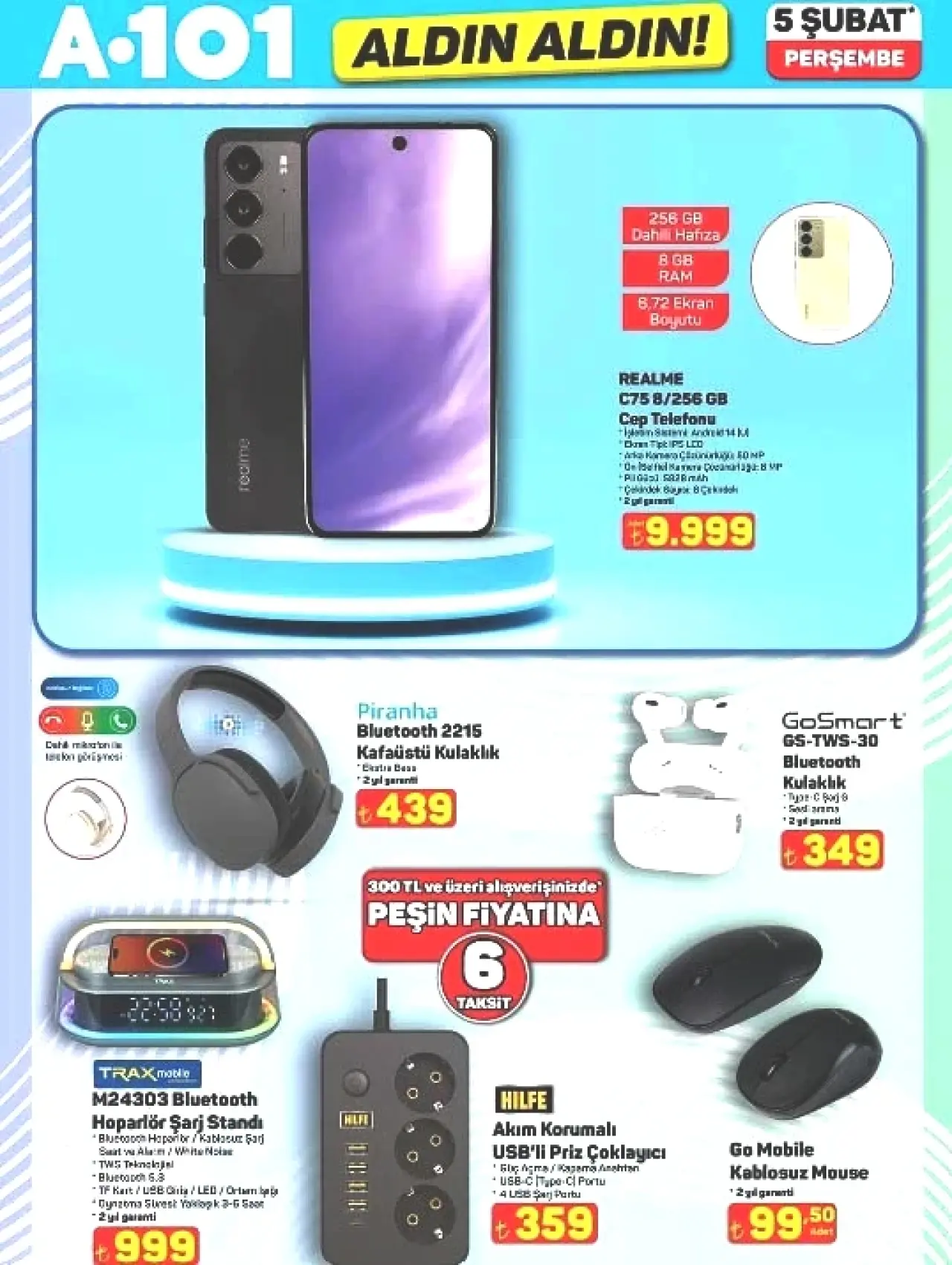 A101'in "Aldın Aldın" kampanyası kapsamında Perşembe günü yeni ürünleri duyuruldu. 5 Şubat 2026 tarihinde geçerli olacak A101 aktüel kataloğu; mutfak gereçlerinden teknoloji ürünlerine, oyuncaklardan ev düzenleyicilerine birçok farklı seçenek barındırıyor. A101'in indirim broşüründe; 256 GB kapasiteli cep telefonunu 9.999 TL, 55 inç çerçevesiz UHD Qled WeboS TV'yi 16.999 TL, kablosuz fareyi 99,50 TL, bluetooth hoparlör şarj istasyonunu 999 TL, kafa üstü kulaklıkları 439 TL, çamaşır kurutma makinesini 15.999 TL, çay makinesini 899 TL, kablolu dik süpürgeyi 1.599 TL, akıllı vücut analiz baskülünü 649 TL, tek kişilik yatak alezi 299 TL, çift kişilik yatak alezi 399 TL, kadın termal taytını 219 TL, büyük kozmetik organizerinin fiyatını 589 TL, çekmeceli takı organizerinin fiyatını ise 449 TL; bulaşık süngeri askısını 20 TL, 22 cm emaye derin tencereyi 399 TL, mini muffin kek kalıbını 179 TL, limon presini 49,50 TL, silikon servis malzemelerini 79,50 TL ve mini metal servis malzemelerini 119 TL'den satılacak. A101'in Aldın Aldın kataloğu, bu hafta neler içeriyor? İşte 5 Şubat 2026 tarihli A101 aktüel kataloğunda sunulan yeni ürünlerin tam listesi...
