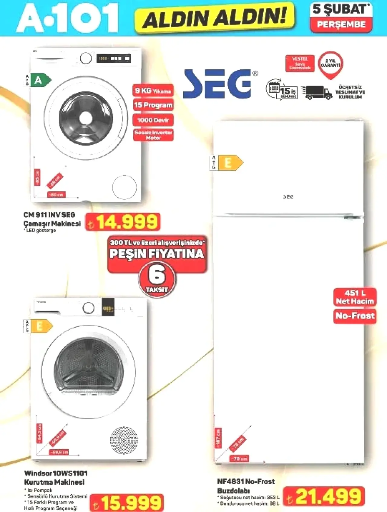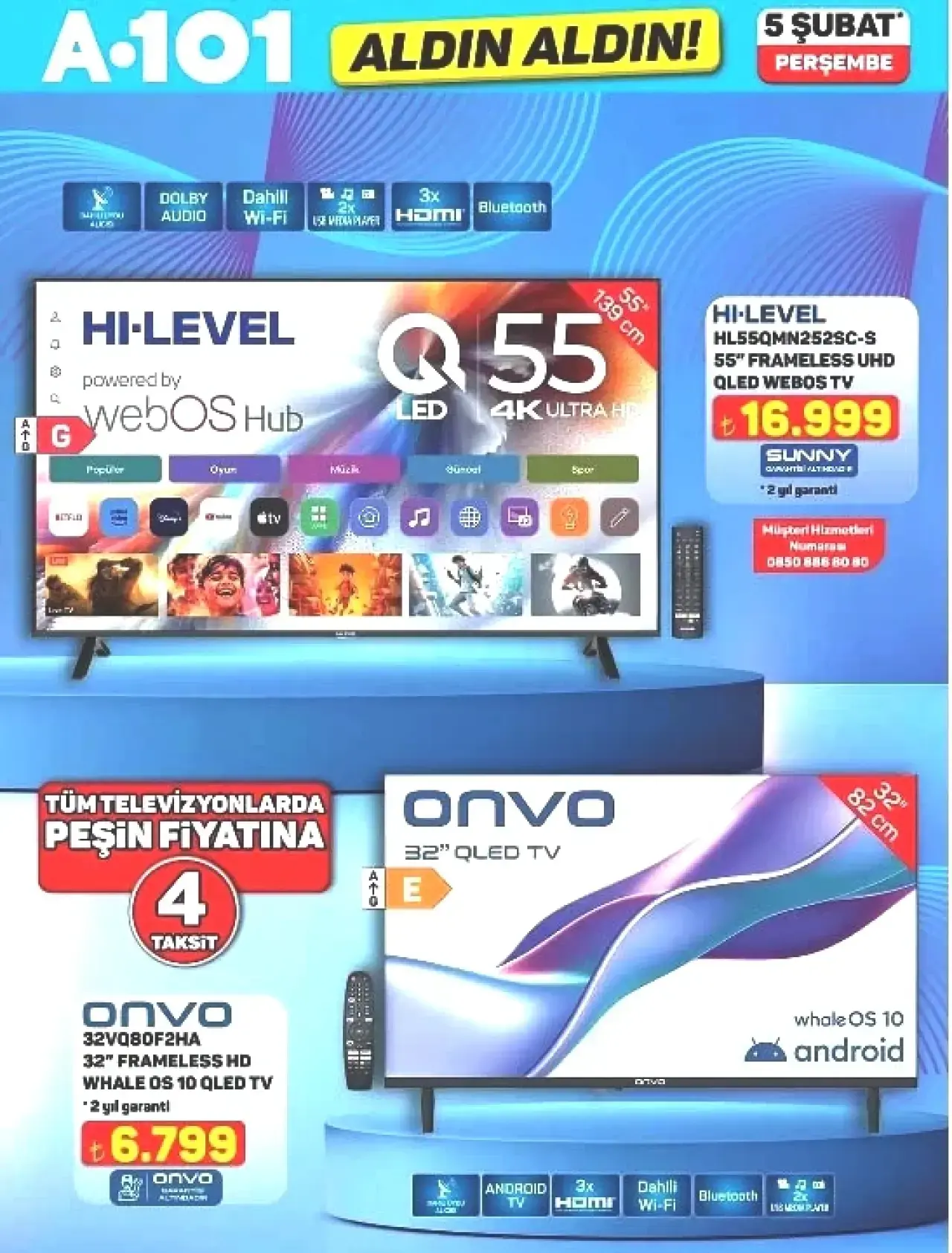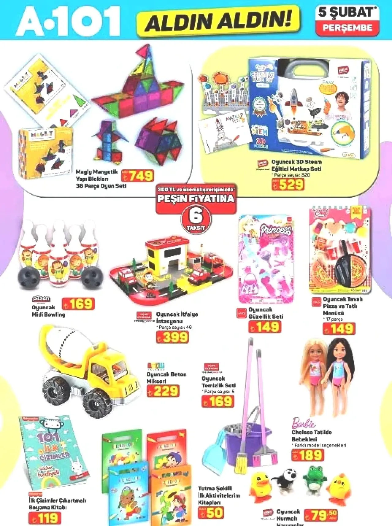 A101'in "Aldın Aldın" kampanyası kapsamında Perşembe günü yeni ürünleri duyuruldu. 5 Şubat 2026 tarihinde geçerli olacak A101 aktüel kataloğu; mutfak gereçlerinden teknoloji ürünlerine, oyuncaklardan ev düzenleyicilerine birçok farklı seçenek barındırıyor. A101'in indirim broşüründe; 256 GB kapasiteli cep telefonunu 9.999 TL, 55 inç çerçevesiz UHD Qled WeboS TV'yi 16.999 TL, kablosuz fareyi 99,50 TL, bluetooth hoparlör şarj istasyonunu 999 TL, kafa üstü kulaklıkları 439 TL, çamaşır kurutma makinesini 15.999 TL, çay makinesini 899 TL, kablolu dik süpürgeyi 1.599 TL, akıllı vücut analiz baskülünü 649 TL, tek kişilik yatak alezi 299 TL, çift kişilik yatak alezi 399 TL, kadın termal taytını 219 TL, büyük kozmetik organizerinin fiyatını 589 TL, çekmeceli takı organizerinin fiyatını ise 449 TL; bulaşık süngeri askısını 20 TL, 22 cm emaye derin tencereyi 399 TL, mini muffin kek kalıbını 179 TL, limon presini 49,50 TL, silikon servis malzemelerini 79,50 TL ve mini metal servis malzemelerini 119 TL'den satılacak. A101'in Aldın Aldın kataloğu, bu hafta neler içeriyor? İşte 5 Şubat 2026 tarihli A101 aktüel kataloğunda sunulan yeni ürünlerin tam listesi...