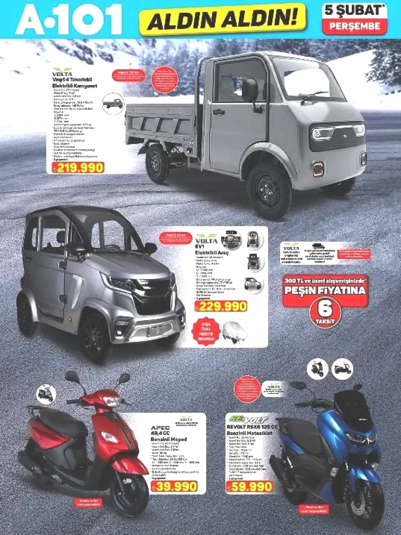 A101, bu haftaki kataloğunda yeni ürünlerini tanıttı. 5 Şubat 2026 Perşembe günü raflarda indirimli fırsatlar alışveriş tutkunlarını bekliyor. Aktüel broşürde robot süpürge 7.999 TL, elektrikli kamyonet 219.990 TL, EV1 elektrikli araç 229.990 TL, 36 parçalık manyetik yapı blokları 749 TL, portatif buharlı kırışık giderici 849 TL, ultrasonik hava nemlendirici 949 TL, kameralı akıllı evcil hayvan besleyici 2.799 TL, halı yıkama makinesi 6.499 TL, ayarlanabilir laptop sehpası 799 TL ve 2 kapaklı çok amaçlı dolap 2.499 TL yer alıyor. A101 Aldın Aldın aktüel ürünler kataloğu ile bu hafta da zengin seçenekler sizi bekliyor. 5 Şubat 2026 indirimlerini keşfedin!