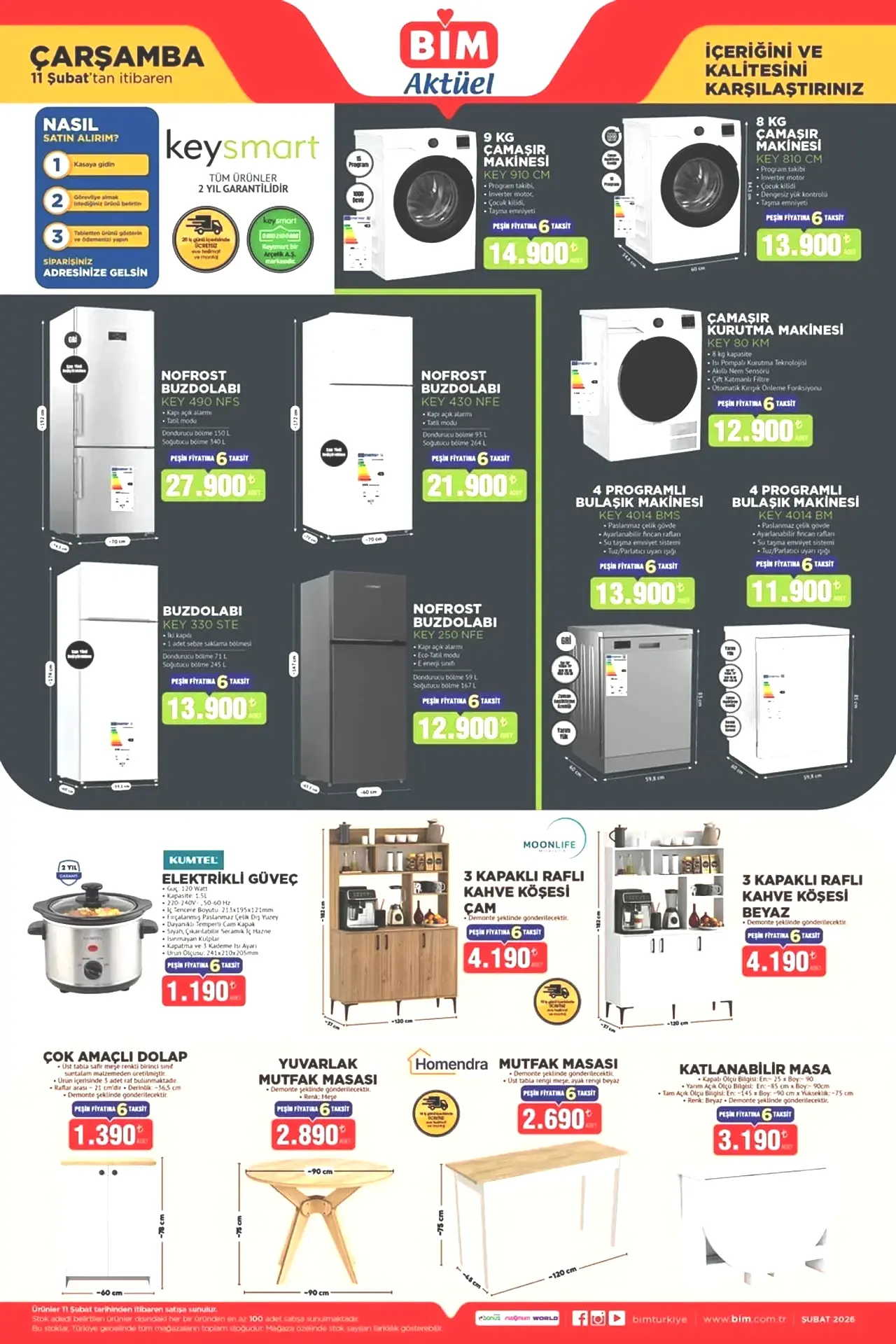 BİM, her hafta çarşamba ve cuma günleri güncel ürünlerini duyuruyor. 6-13 Şubat tarihleri arasında indirime girecek ürünlerin listesi de yayınlandı. Bu haftanın cuma günü, 55 İnç Frameless Ultra HD Qled Televizyon 16.900 TL, Akıllı Saat 299 TL, Akıllı Bileklik 299 TL, Kablosuz Kulaküstü Bluetooth Kulaklık 749 TL, Manyetik Telefon Tutucu 599 TL, Tablet Telefon Standı 175 TL fiyatlarından satışa sunulacak. Özellikle yeni evlenecek çiftler için çeşitli elektronik ev aletlerinde indirimler mevcut. İstasyon Ütü 3.450 TL, Çay Makinesi 1.490 TL, Personal Blender 999 TL, Dikey Süpürge 1.390 TL, Saç Kurutma Makinesi 790 TL, Saç Düzleştirici Tarak 790 TL, Üflemeli Saç Şekillendirme Seti 1.590 TL ve Vücut Bakım Seti 399 TL gibi ürünler raflarda yer alacak. İşte, BİM'in 6-13 Şubat aktüel kataloğu…