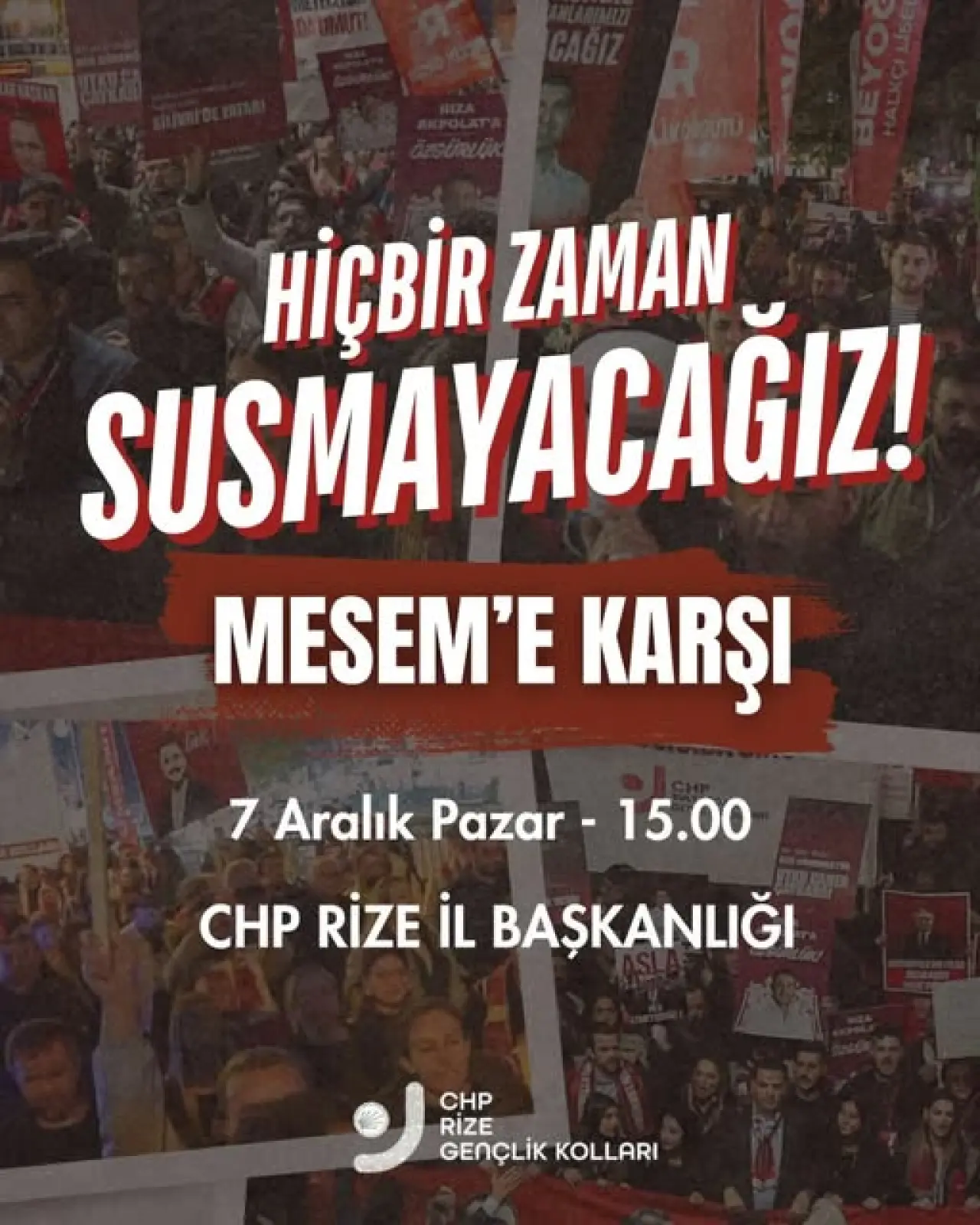 Hazırlanan afişte, “Hiçbir zaman susmayacağız! MESEM’e karşı” ifadeleri yer alırken, 7 Aralık Pazar günü saat 15.00’te CHP Rize İl Başkanlığı binasında bir etkinlik düzenleneceği duyuruldu.