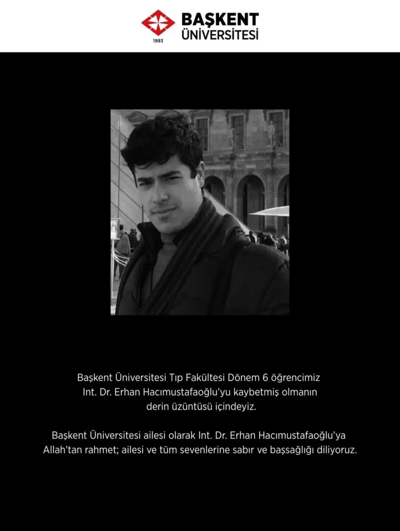 “Başkent Üniversitesi Tıp Fakültesi Dönem 6 öğrencimiz Int. Dr. Erhan Hacımustafaoğlu’yu kaybetmiş olmanın derin üzüntüsü içindeyiz. Başkent Üniversitesi ailesi olarak Int. Dr. Erhan Hacımustafaoğlu’na Allah’tan rahmet; ailesi ve tüm sevenlerine sabır ve başsağlığı diliyoruz.”
