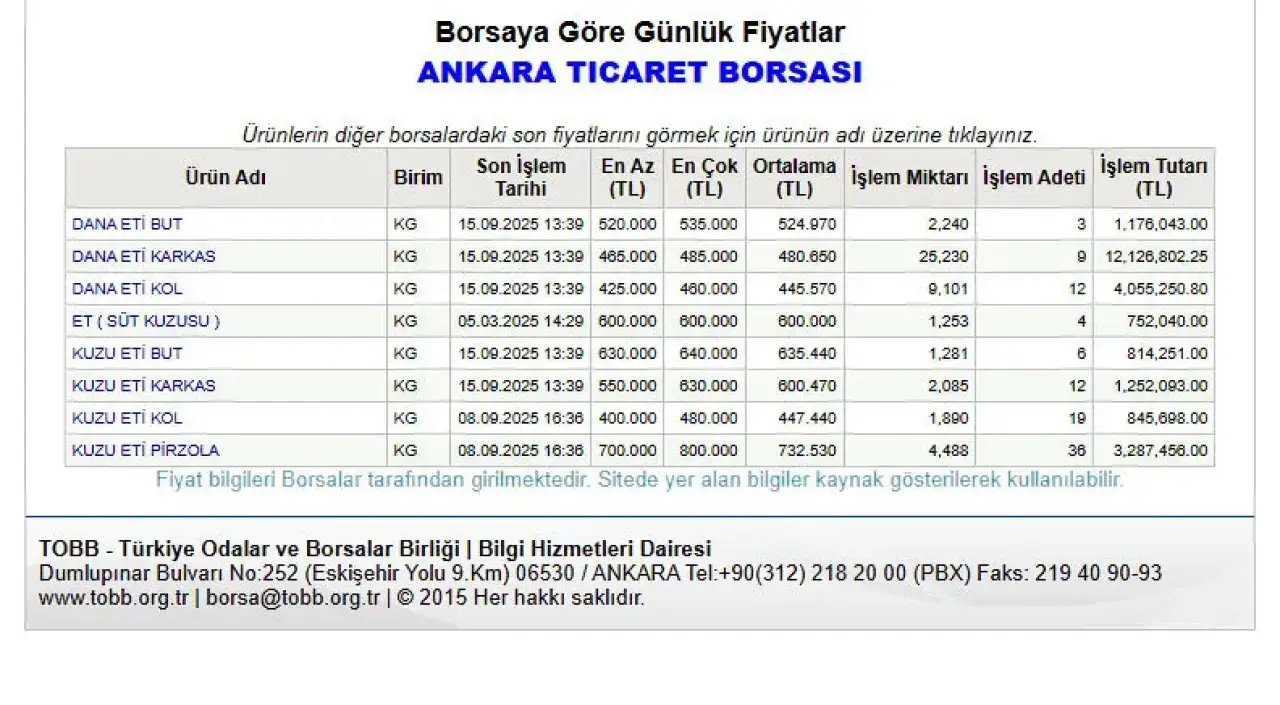 Ankara Ticaret Borsası 21 Kasım 2025 Cuma Kırmızı Et Fiyatları