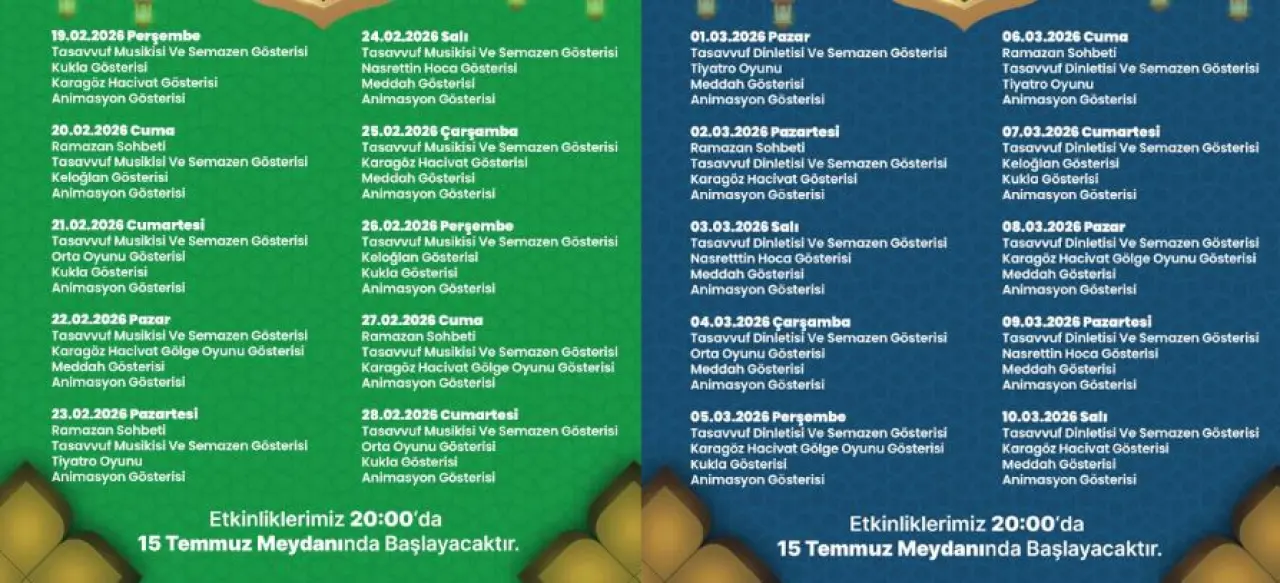 Rize Belediyesi, 2026 Ramazan'ında manevi atmosferi yaşatmak için 19 Şubat – 10 Mart tarihleri arasında 15 Temmuz Meydanı'nda kapsamlı etkinlikler düzenleyecek. Çocuklar için atölyeler ve geleneksel gösterilerle dolu bir program, herkesi Ramazan coşkusunu paylaşmaya davet ediyor.