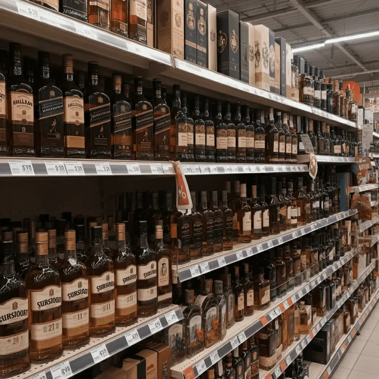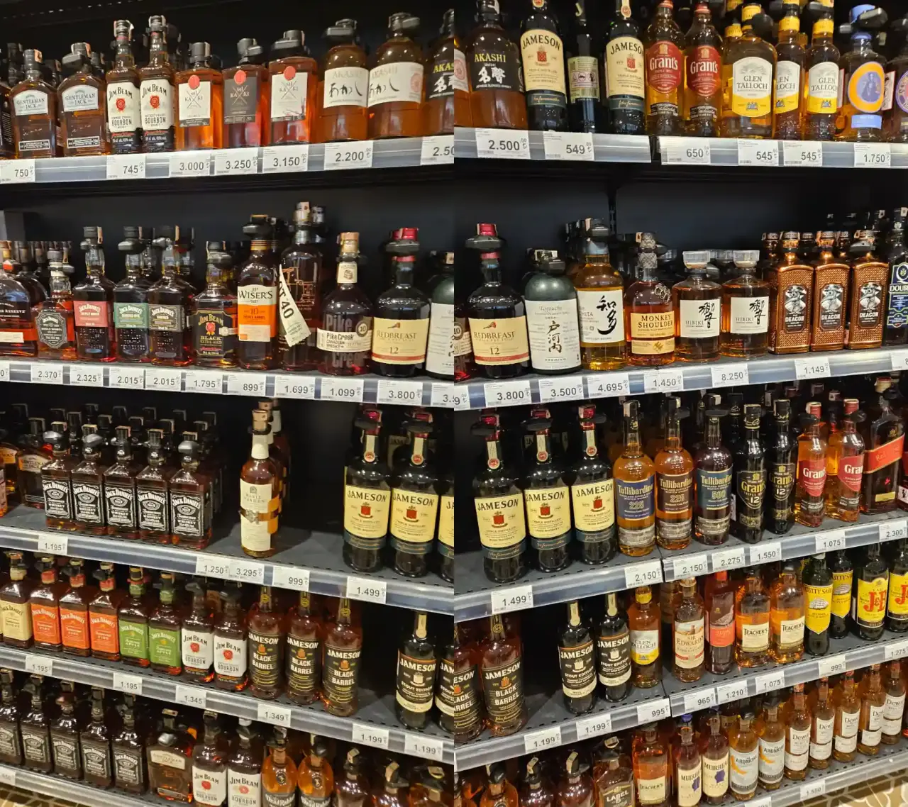 Alkol reyonlarındaki ürünler arasında şampanya, köpüklü şarap, kırmızı, beyaz, rose şarap, bira, likör, tekila, viski ve diğer alkollü içecekler bulunur.