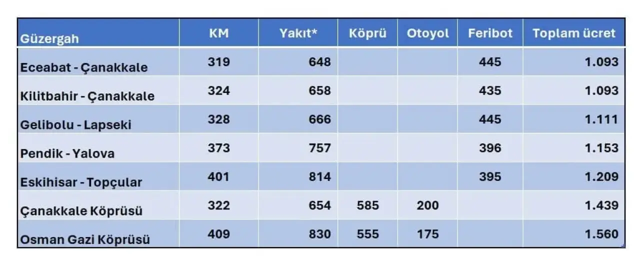 O-5 ve E90 üzerinden Çanakkale 409 km. Sadece köprü geçişi 555 TL. Bağlantı yollarını kullanırsanız 730 TL ödemeniz gerekiyor.
