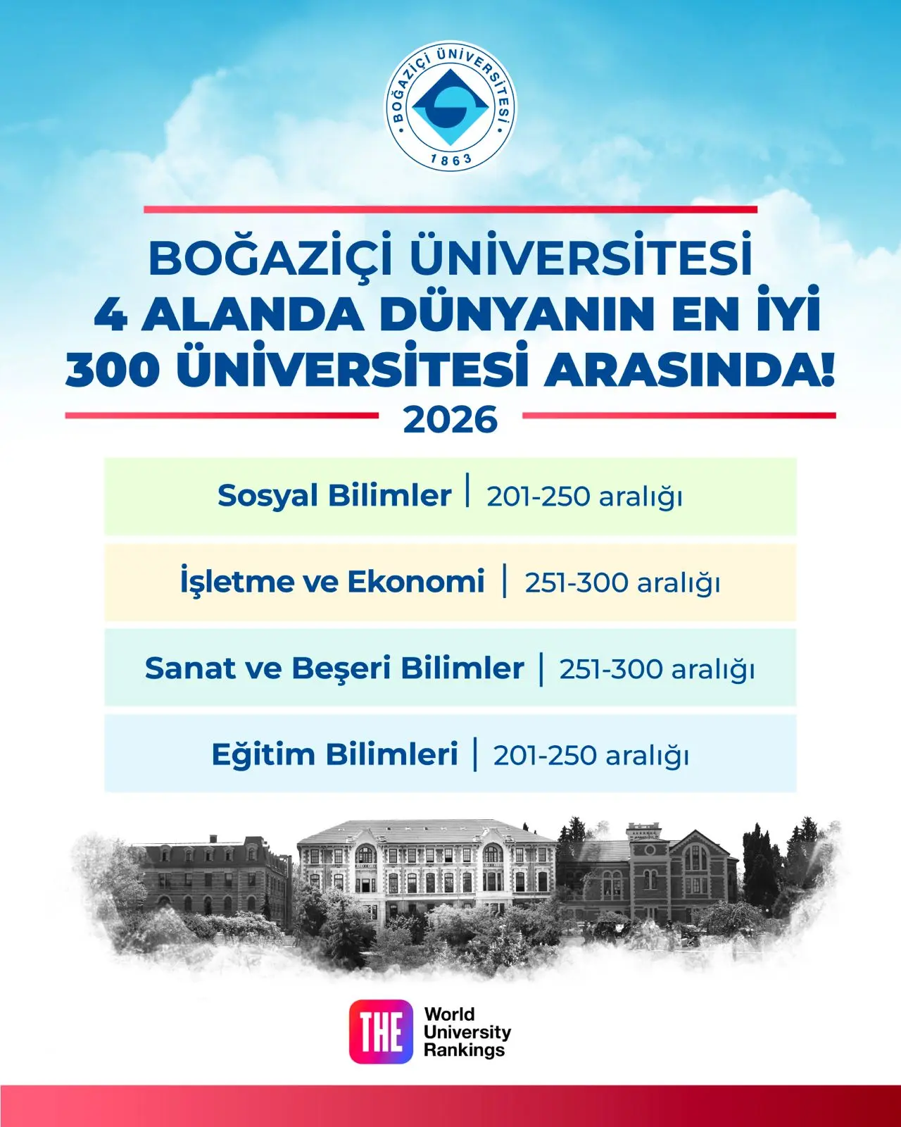 Boğaziçi Üniversitesi, dünyanın en saygın yükseköğretim derecelendirme kuruluşlarından Times Higher Education (THE) tarafından açıklanan 2026 Alan Bazlı Dünya Üniversite Sıralamalarında (World University Rankings by Subject) önemli bir başarıya imza attı. Üniversite; Eğitim ve Sosyal Bilimler alanlarında ilk 250, İşletme-Ekonomi ile Beşeri Bilimler alanlarında ise ilk 300 üniversite arasında yer aldı.