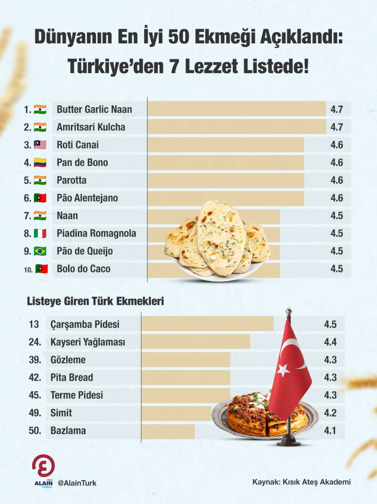 Bu yılki sıralamada Hindistan, Portekiz ve İtalya mutfağı dikkat çekerken, Türkiye 7 farklı ekmek çeşidiyle listede yer alarak dünya mutfağındaki başarısını bir kez daha kanıtladı.