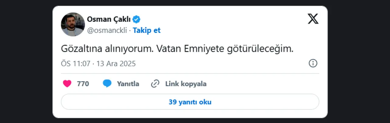Gazeteci Osman Çaklı, dün akşam saatlerinde "mevcutlu" şekilde gözaltına alınarak Vatan Emniyet'e götürüldü ve geceyi nezarethanede geçireceği bildirildi. Çaklı'nın Okmeydanı'nda bir hastaneye düzenlenen saldırıya ilişkin yaptığı paylaşım ve "cumhurbaşkanına hakaret" iddiasıyla gözaltına alındığı belirtildi.