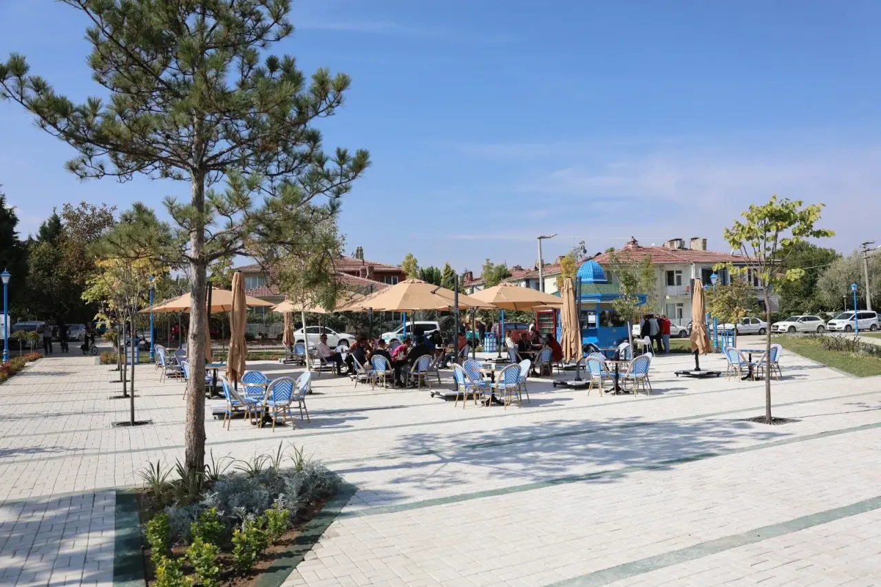 Gölge sağlayan ağaçlar ve oturma alanları bulunuyor.
