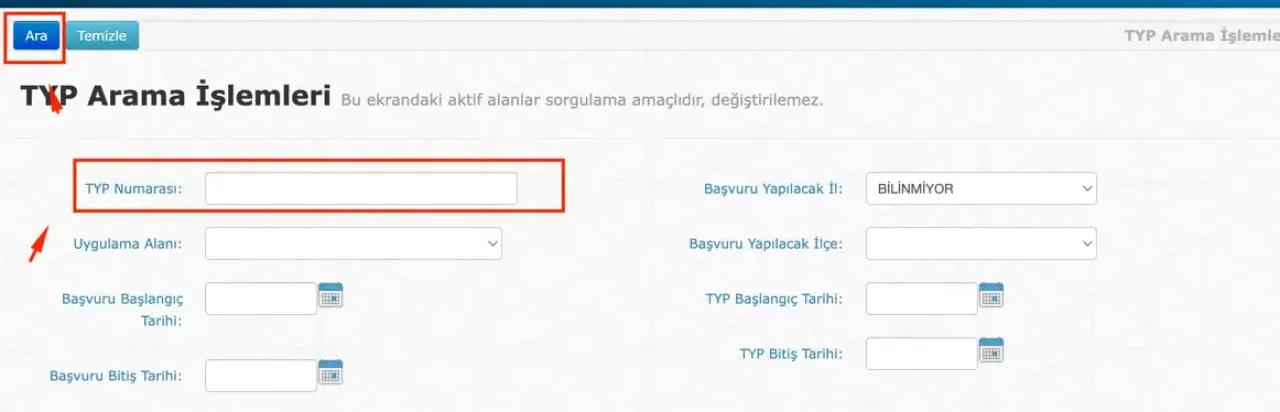3. Adım: İlgili bağlantıya tıkladıktan sonra karşınıza aşağıdaki görseldedi gibi bir ekran gelecek ve ilgili görselde eğer biliyorsanız TYP numarası veya Birim yazan kısma kendi ilinizi girebilirsiniz. Yada Ara butonuna tıklayarak tüm TYP Personel Alımı ilanlarına ulaşabilirsiniz.