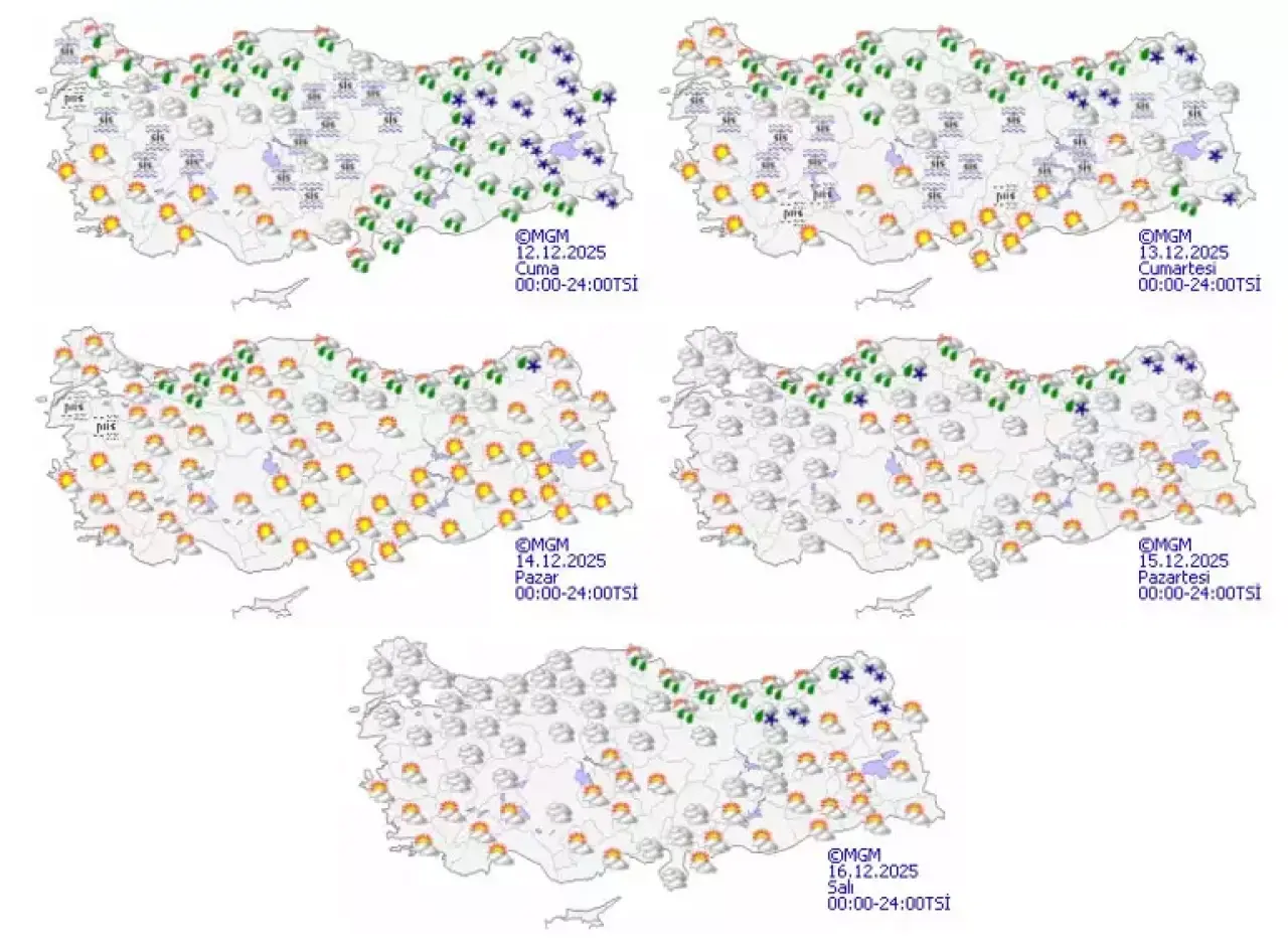 Meteoroloji Genel Müdürlüğü tarafından yapılan tahminlere göre: Ülkemizin kuzey, iç ve doğu kesimleri parçalı ve çok bulutlu, Marmara'nın kuzeyi, Karadeniz (Çorum Haric), Doğu ve Güneydoğu Anadolu ile Sivas, Niğde, Nevşehir, Kayseri, Hatay, Kahramanmaraş, Osmaniye ve Adana’nın doğusunun yağışlı geçeceği tahmin ediliyor. Yağışların kıyı ve iç kesimlerde yağmur ve sağanak, Karadeniz’in iç kesimleri, Doğu Anadolu ile Sivas ve Kayseri'nin yükseklerinde karla karışık yağmur ve kar şeklinde olması bekleniyor. Gece ve sabah saatlerinde iç kesimlerde pus ve yer yer sis bekleniyor.