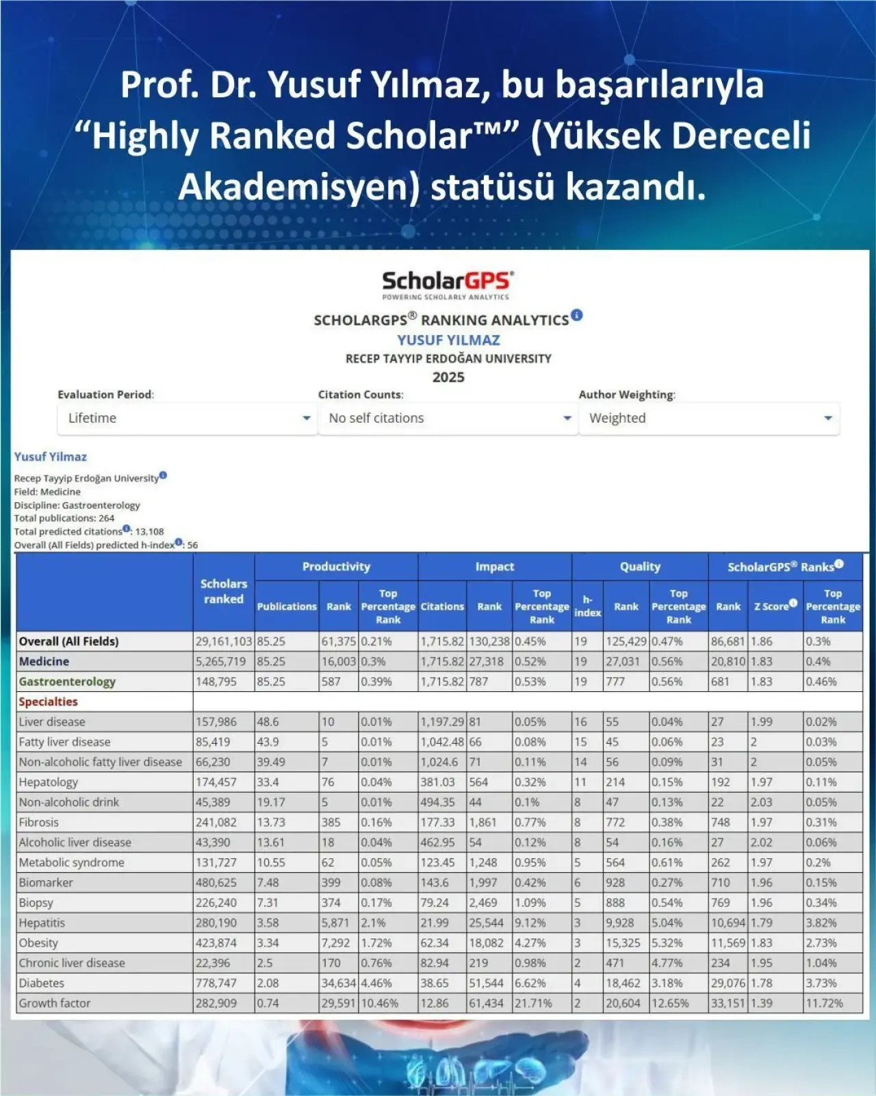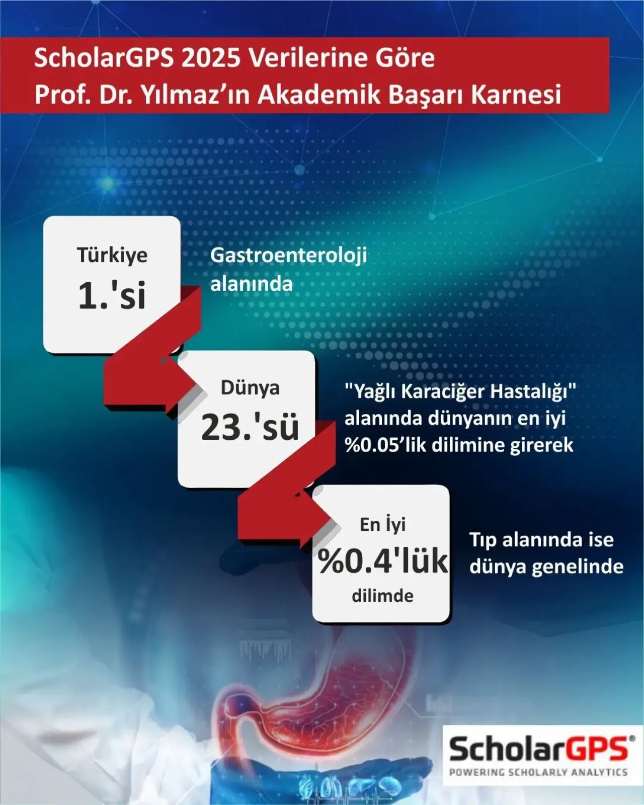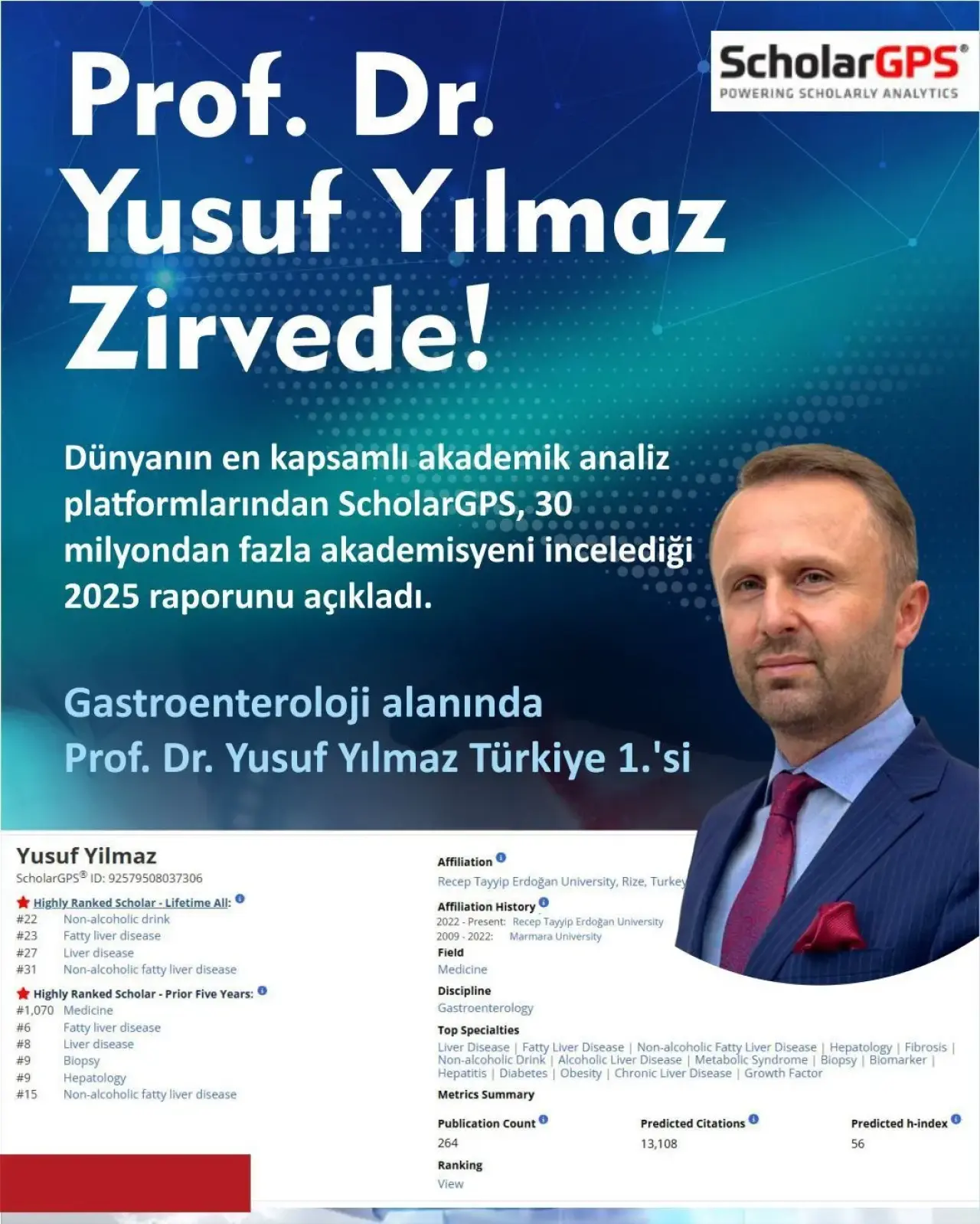 Dünyanın en kapsamlı akademik analiz ve sıralama platformlarından biri olan ScholarGPS, 2025 yılı "Scholar, Institutional, and Country Rankings" (Akademisyen, Kurum ve Ülke Sıralamaları) sonuçlarını açıkladı. 30 milyondan fazla akademisyen profilini ve 200 milyondan fazla yayını analiz eden platformun verilerine göre; Prof. Dr. Yusuf Yılmaz, Gastroenteroloji alanında Türkiye 1.'si olarak büyük bir başarıya imza attı.