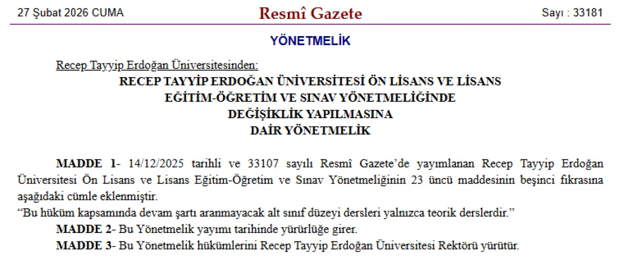 Recep Tayyip Erdoğan Üniversitesi (RTEÜ) bünyesinde eğitim gören ön lisans ve lisans öğrencilerini ilgilendiren Eğitim-Öğretim ve Sınav Yönetmeliğinde güncelleme yapıldı. Resmî Gazete’de yayımlanan düzenleme ile alt sınıftan alınan derslerin devam zorunluluğu konusunda açıklık getirildi.