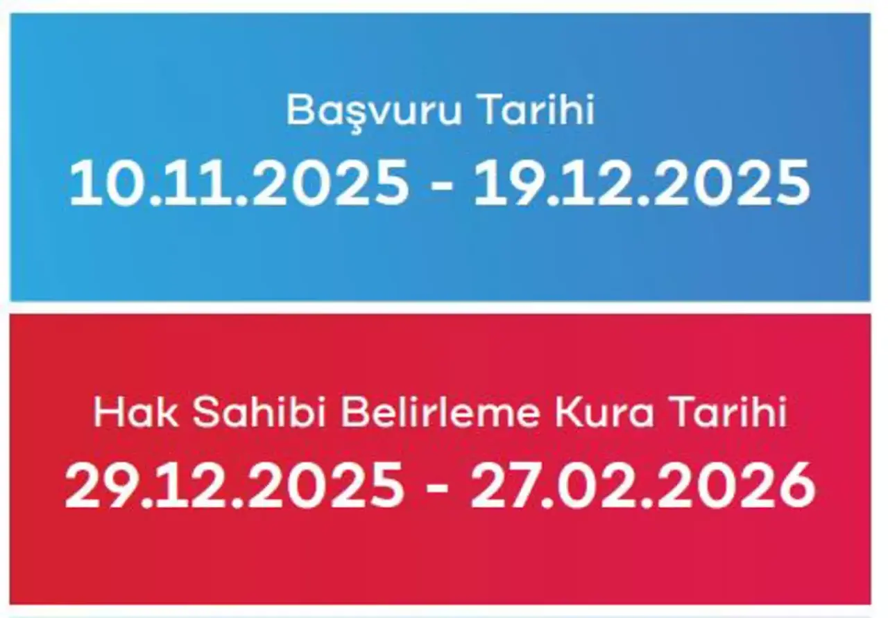 TOKİ tarafından açıklanan 500.000 konut projesine başvurular 10 Kasım 2025 tarihinde başladı. Vatandaşlar 19 Aralık 2025 tarihine kadar başvuru yapabilecek. Hak sahipleri belirleme kura tarihleri 29 Aralık 2025 tarihinde başlayacak ve 24 Şubat 2026 tarihinde son bulacak.