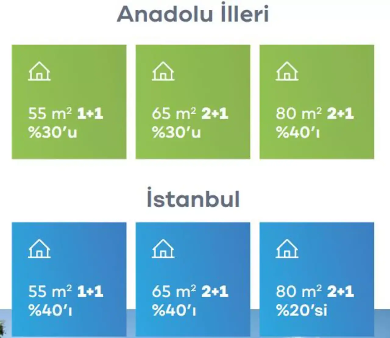 Anadolu illerindeki daireler; 1+1 55 metrekare, 2+1 65 metrekare, 2+1 80 metrekare ve İstanbul'daki konutlar; 1+1 55 metrekare, 2+1 65 metrekare, 2+1 80 metrekare olarak açıklandı.