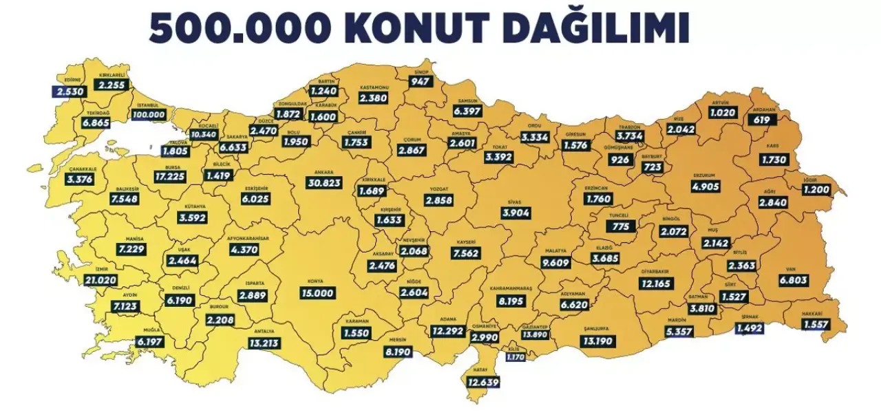 TOKİ tarafından açıklanan duyuruda, konut dağılımlarına yer verildi. Buna göre; İstanbul'da 100.000, Konya'da 15.000, Ankara'da 30.823, Şanlıurfa'da 13.190, İzmir'de 21.020, Antalya'da 13.213, Gaziantep'te 13.890, Hatay'da 12.639, Bursa'da 17.225, Diyarbakır'da 12.165 ve Ardahan'da 619 daire kura yöntemiyle alıcısını bulacak. Ayrıca TOKİ tarafından paylaşılan daire dağılımıyla alakalı detaylı görsel aşağıda yer alıyor.