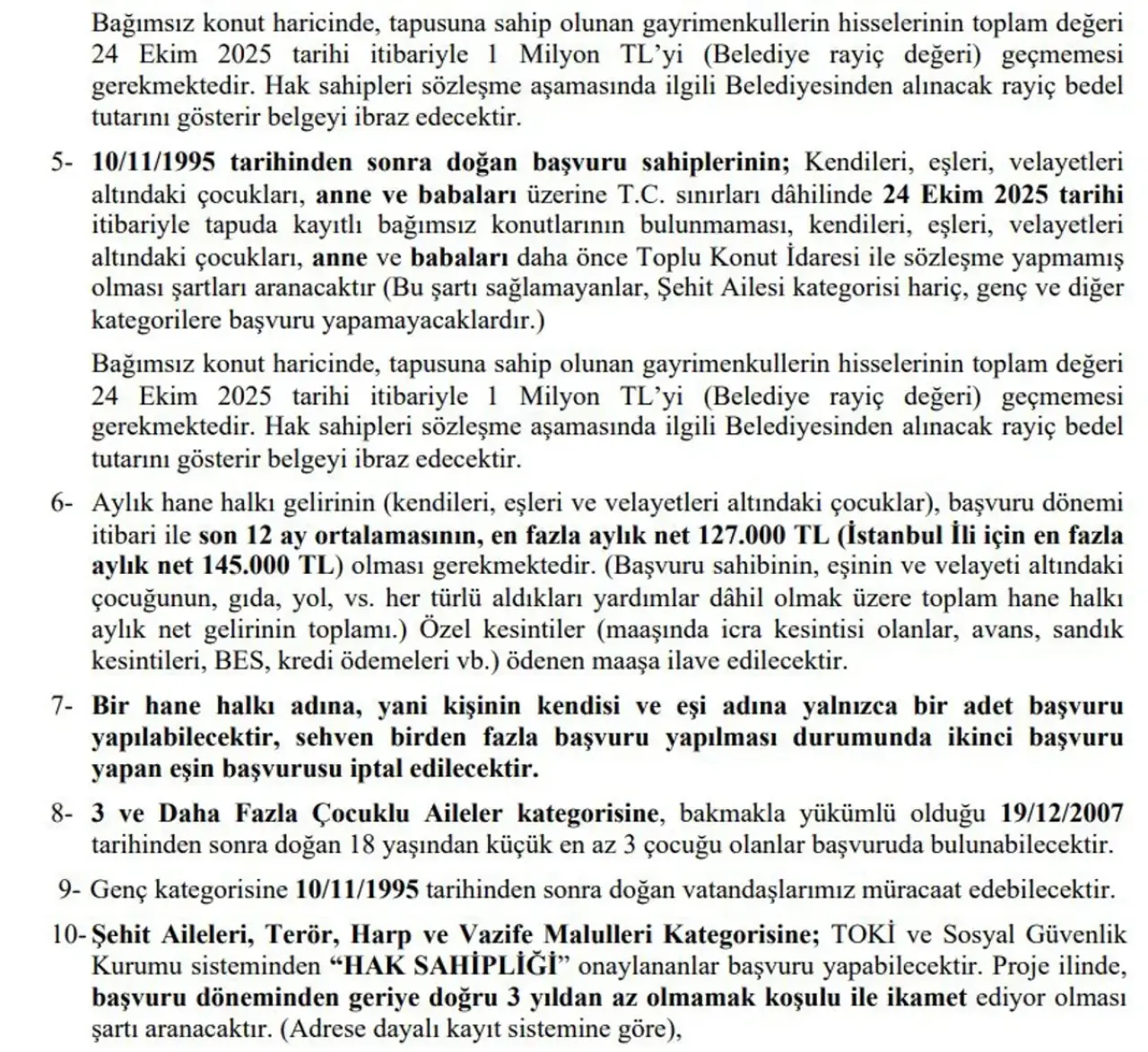 Aylık hane halkı gelirinin (kendileri, eşleri ve velayetleri altındaki çocuklar), başvuru dönemi itibariyle son 12 ay ortalamasının, en fazla aylık net 127.000 TL (İstanbul İli için en fazla aylık net 145.000 TL) olması gerektiği açıklandı (başvuru sahibinin, eşinin ve velayeti altındaki çocuğunun, gıda, yol, vs. her türlü aldıkları yardımlar dahil olmak üzere toplam hane halkı aylık net gelirinin toplamı). Ayrıca özel kesintilerin (maaşında icra kesintisi olanlar, avans, sandık kesintileri, BES, kredi ödemeleri gibi) ödenen maaşa ilave edileceği aktarıldı.