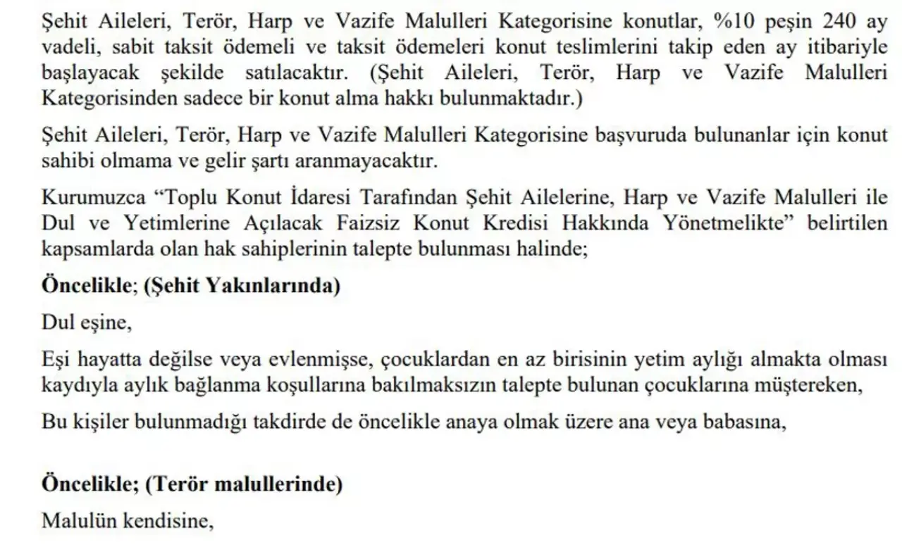 Yüzde 10 peşinat, 240 ay vade ile daire sahibi olunabileceği, başlangıç taksit tutarının 6 ayda 1 bir önceki memur maaş artış oranına göre güncelleneceği duyuruldu.