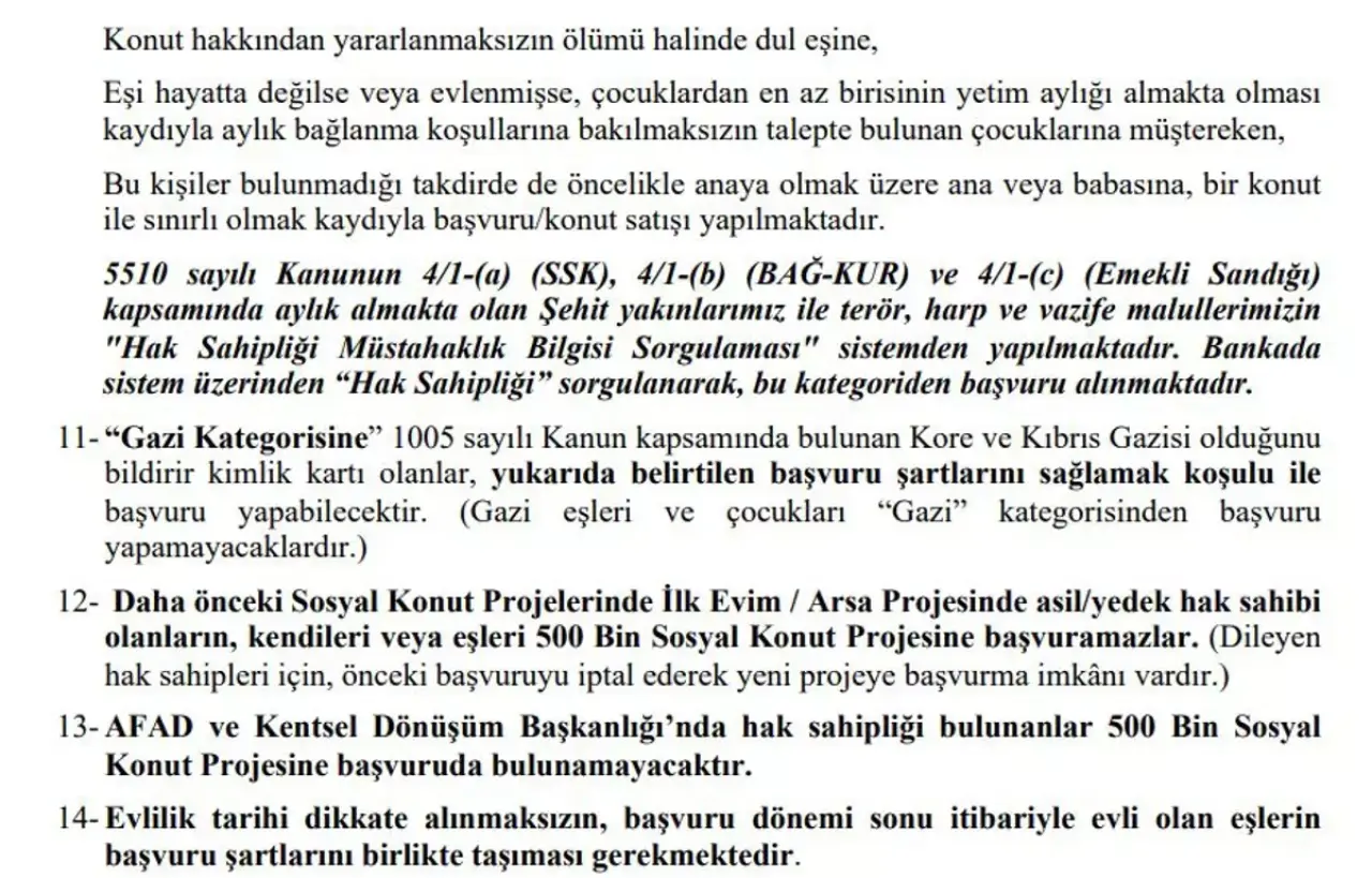 Bir hane halkı adına, yani kişinin kendisi ve eşi adına sadece bir adet başvuru yapabileceği belirtildi. Sehven birden fazla başvuru yapılması durumunda, ikinci başvuru yapan eşin başvurusunun iptal edileceği aktarıldı.