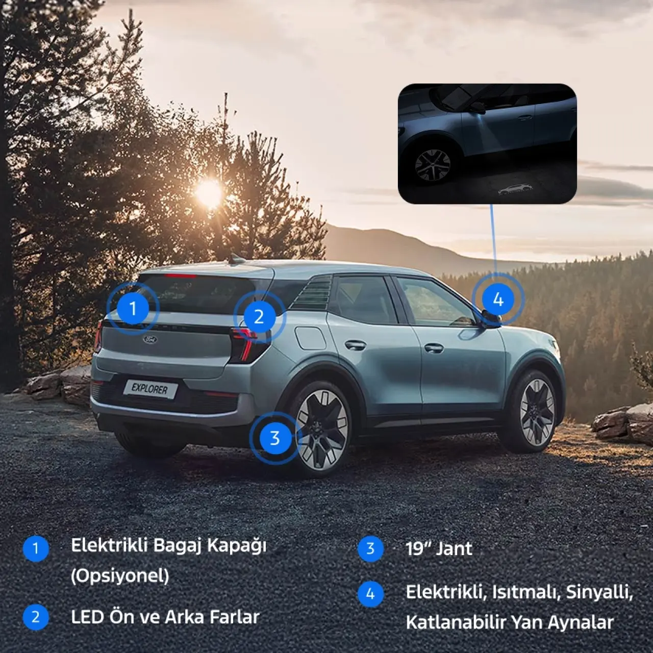 Özellik Explorer SELECT Explorer PREMIUM Farlar LED Ön ve Arka Farlar Matrix LED Ön Farlar Jant 19 inç Alüminyum 20 inç Alüminyum Ses Sistemi 7 Hoparlör 10 Hoparlör (B&O Soundbar) Bagaj Kapağı Opsiyonel Elektrikli Standart Elektrikli (Hands-free) Cam Tavan Standart Tavan Panoramik Cam Tavan