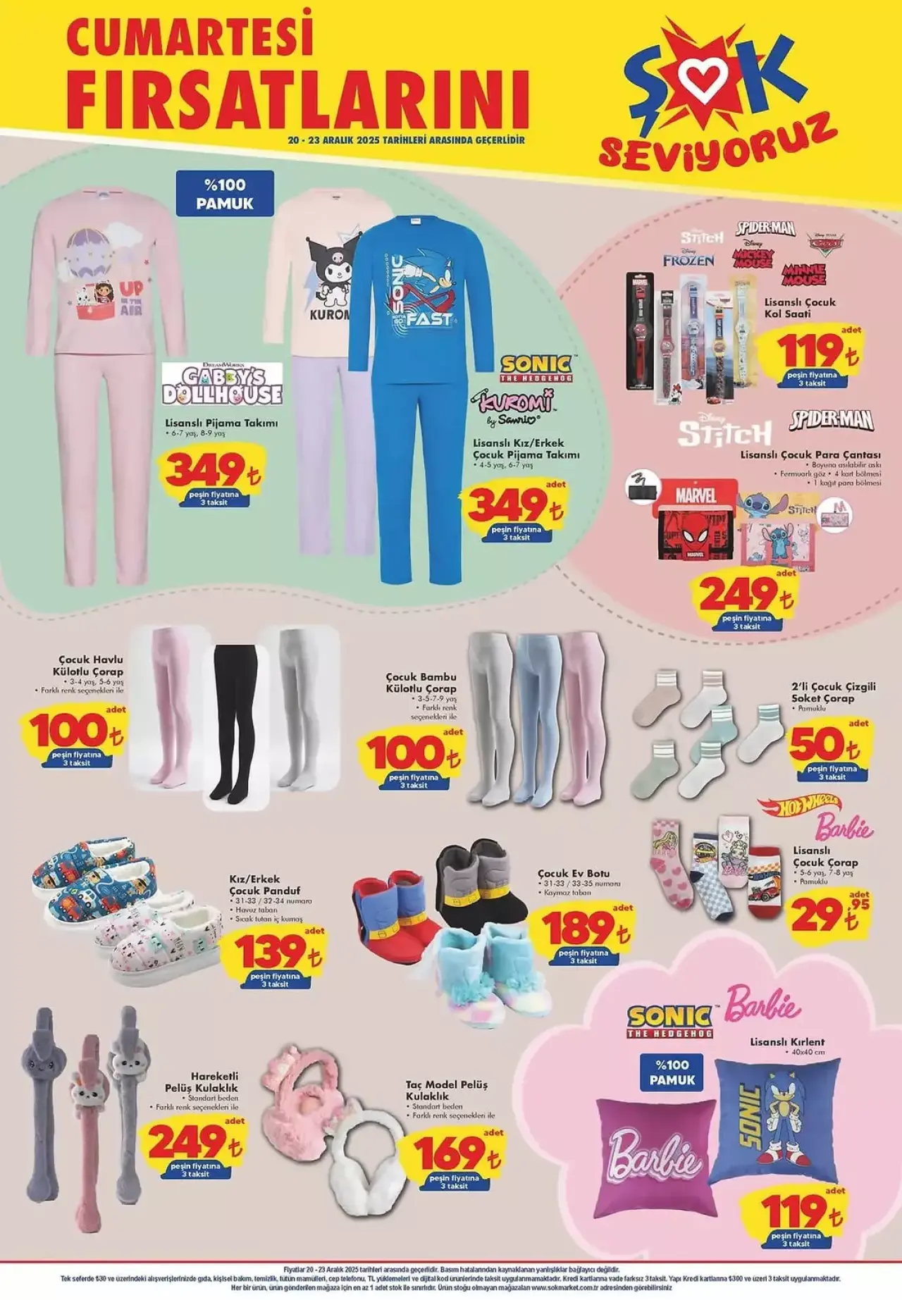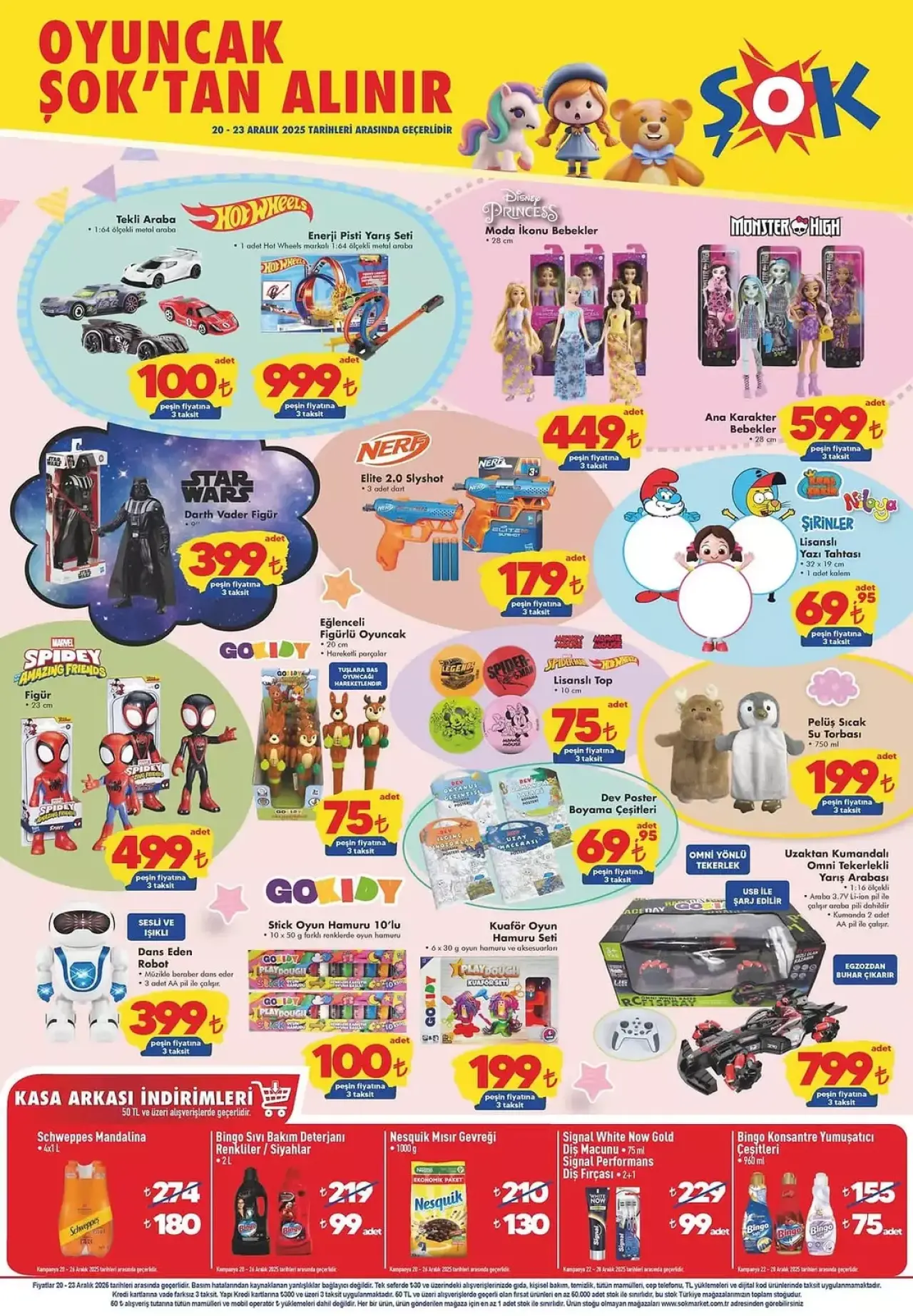 Bu hafta ŞOK markete lisanslı pijama takımlarından çocuk kol saatlerine, panduflardan pelüş kulaklıklara kadar birçok çocuk ürünü geliyor. Oyuncak kategorisinde Hot Wheels arabalar, yarış setleri, bebekler, figürler ve uzaktan kumandalı araçların yanında ev ve aksesuar tarafında lisanslı kırlentler ve pelüş sıcak su torbaları öne çıkarken oyun hamuru setleri ve boyama ürünleri de miniklerin yaratıcılığını desteklemek için ŞOK'a geliyor.