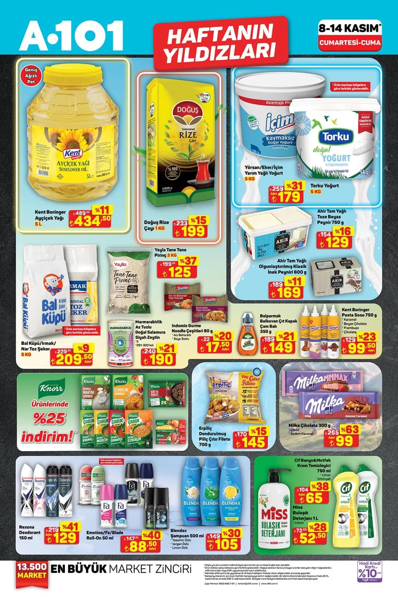 Her hafta birbirinden çeşitli ve cazip fırsatlarla tüketicinin yüzünü güldüren A101, 8 Kasım'dan itibaren geçerli olacak yeni indirimli ürünler kataloğunu yayınladı. 14 Kasım'a kadar sürecek indirimlerde, ayçiçek yağından yoğurda, atıştırmalıklardan kırmız et ürünlerine kadar pek çok kategori dikkat çekiyor.