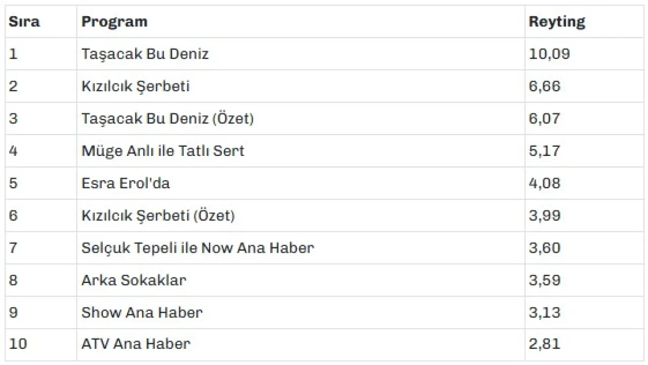 Taşacak Bu Deniz’in özet bölümü ise 6,07 reytingle üçüncü sıraya yerleşti.
