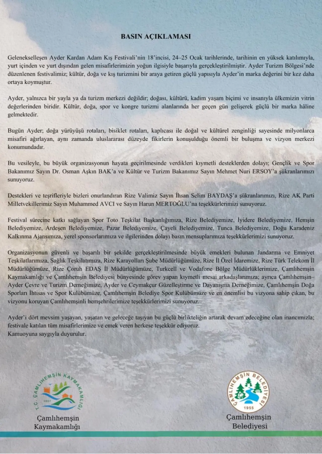 Çamlıhemşin Kaymakamlığı ve Belediye Başkanlığı yayımladıkları ortak açıklamayla 18. Ayder Kardan Adam Kış Festivali'nin organize edilmesine destek verenlere ve katılımcılara teşekkürlerini iletti.