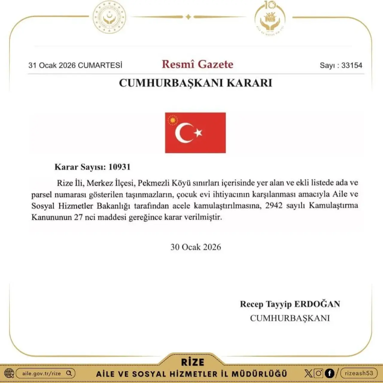 Rize Aile ve Sosyal Hizmetler İl Müdürü Hüseyin Güçlü” Cumhurbaşkanımız Sayın Recep Tayyip Erdoğan’ın tensipleriyle, İlimiz Merkez İlçesi Pekmezli Köyü’nde çocuk evleri sitesi ihtiyacının karşılanması amacıyla tesis edilen acele kamulaştırma işlemlerine ilişkin karar, Resmî Gazetede yayımlanmıştır. İlimize hayırlı olmasını temenni ediyoruz." Dedi.