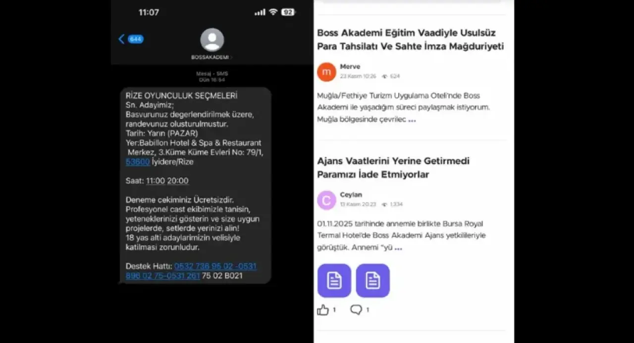 Rize’deki seçmeler için gönderilen SMS’lerde “ücretsiz deneme çekimi” ifadeleri yer alıyor. Ancak iletişim numaralarının daha önce benzer şikayetlerle gündeme gelen firma ile uyuştuğu tespit edildi.