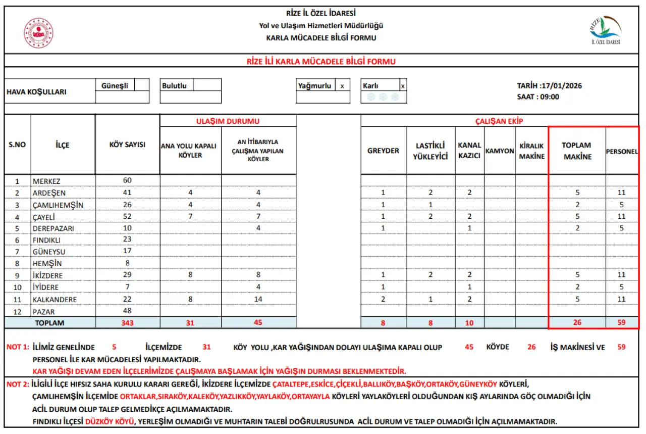Rize'de yoğun kar yağışı nedeniyle 31 köy yolu ulaşıma kapandı. Ardeşen, Çamlıhemşin, Çayeli, İkizdere ve Kalkandere'deki yolların açılması için 45 noktada 26 iş makinesi ile karla mücadele çalışmaları sürüyor. Sürücüler, zincirsiz yola çıkmamaları konusunda uyarıldı.