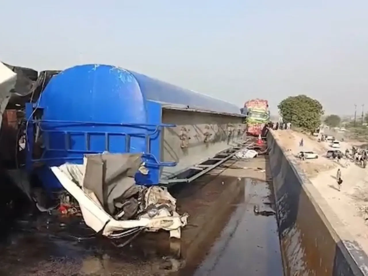 Pakistan'ın Karaçi kentindeki M-9 Otoyolu'nda seyir halindeki petrol tankeri sürücüsünün kontrolünü kaybetmesi sonucu minibüsün üzerine devrildi.