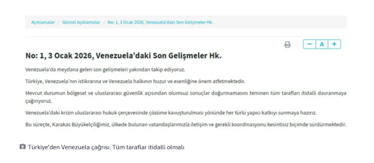 "Türkiye, Venezuela’nın istikrarına ve Venezuela halkının huzur ve esenliğine önem atfetmektedir. Mevcut durumun bölgesel ve uluslararası güvenlik açısından olumsuz sonuçlar doğurmamasını teminen tüm tarafları itidalli davranmaya çağırıyoruz.
