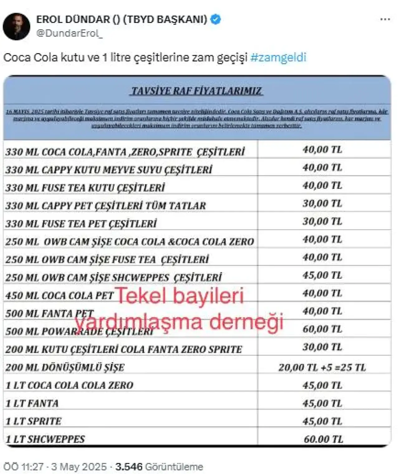Zam haberi, Tekel Bayileri Yardımlaşma Derneği (TBYD) Başkanı Erol Dündar tarafından sosyal medya üzerinden paylaşıldı. Dündar, yaptığı duyuruda özellikle kutu ve 1 litrelik içeceklerde fiyat artışının hissedileceğini belirtti.
