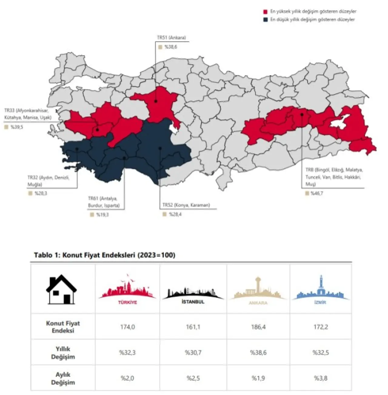Endeks değerleri geçen yılın aynı ayına göre İstanbul'da yüzde 34,4, Ankara'da yüzde 41,9 ve İzmir'de yüzde 30,9 yükseldi.