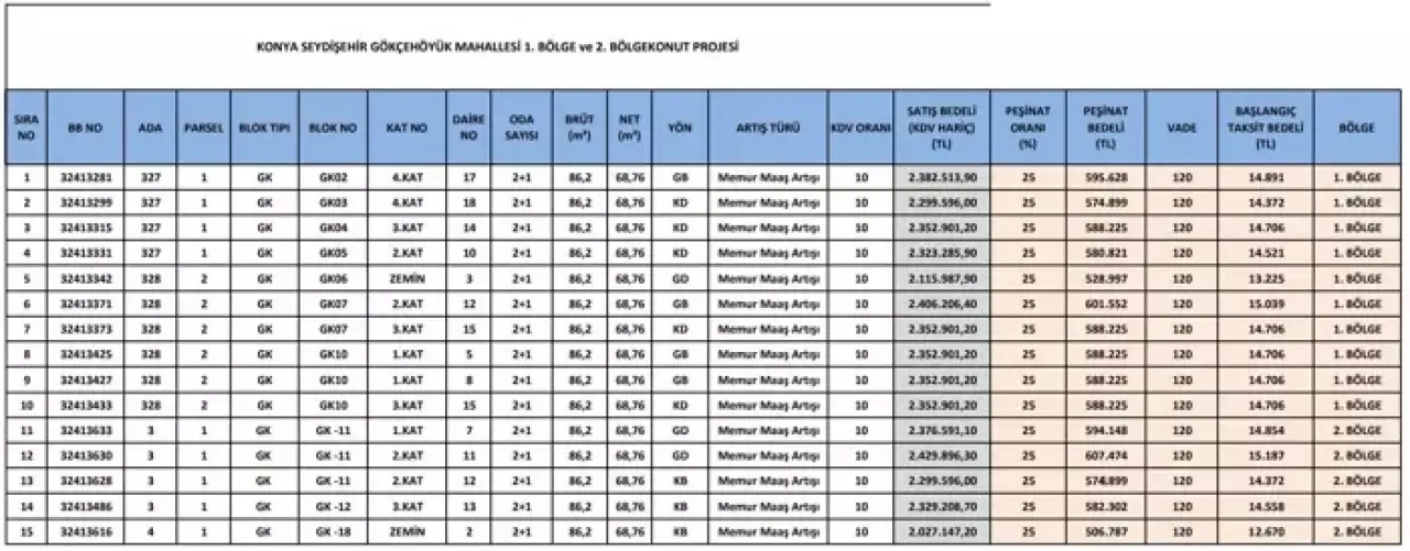 Toplu Konut İdaresi Başkanlığı (TOKİ); Türkiye'de İstanbul, Konya ve Ankara dahil olmak üzere birçok farklı ilde zaman zaman daire satışı gerçekleştiriyor. Genellikle 120 ay vade ile satışa çıkartılan taşınmazlar; şehre, bölgeye ve kata göre farklı fiyatlarda alıcılarını buluyor.