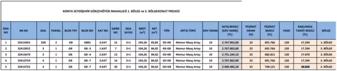 TOKİ tarafından Konya ili, Seydişehir ilçesi, Gökçehöyük mahallesi 1. Bölge 238 adet konut ve 2. Bölge 258 adet konut projesi kapsamında üretilecek 20 adet dairenin satışa çıkartılacağı resmen açıklandı. Bahsedilen dairelerden 15'i 2+1 ve 5'i 3+1 olarak belirtildi.