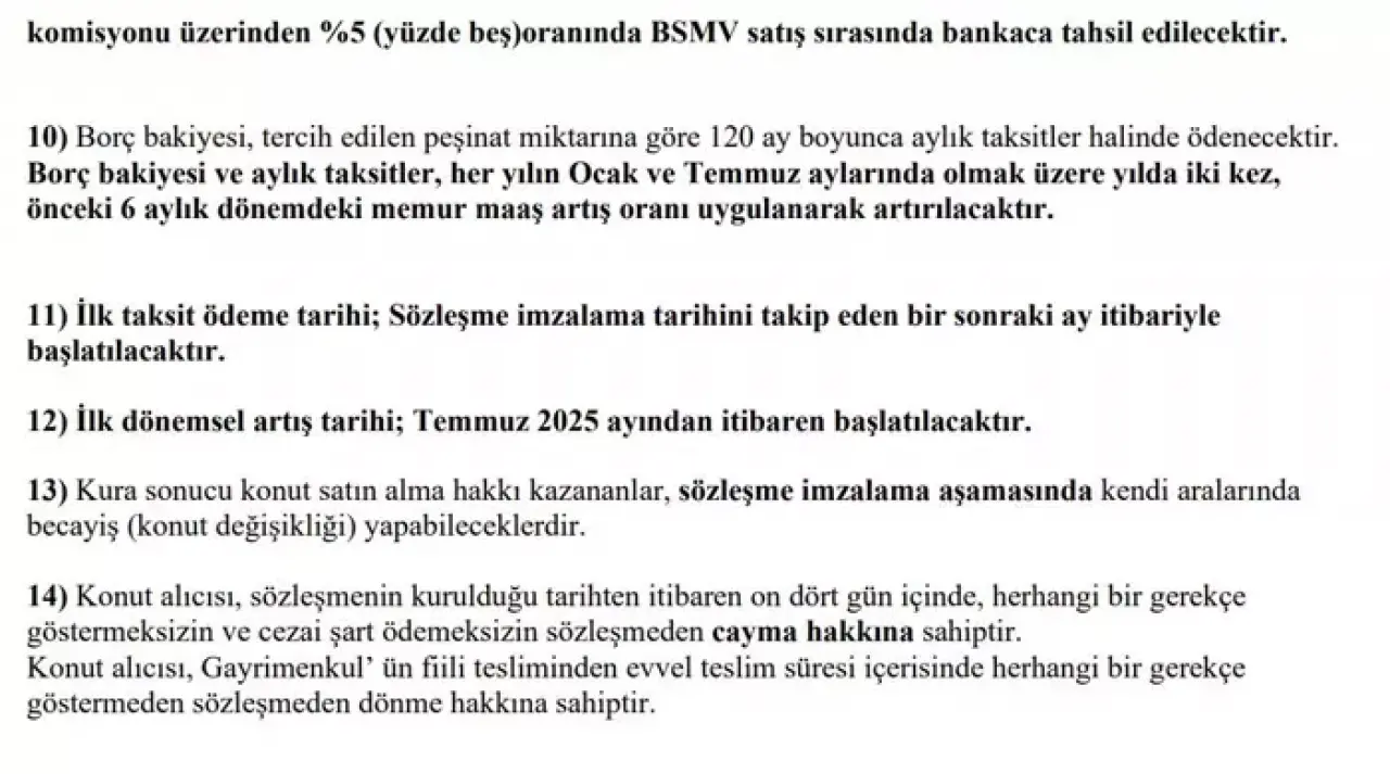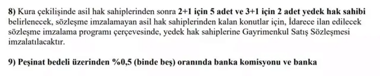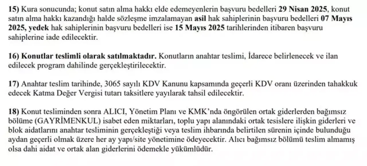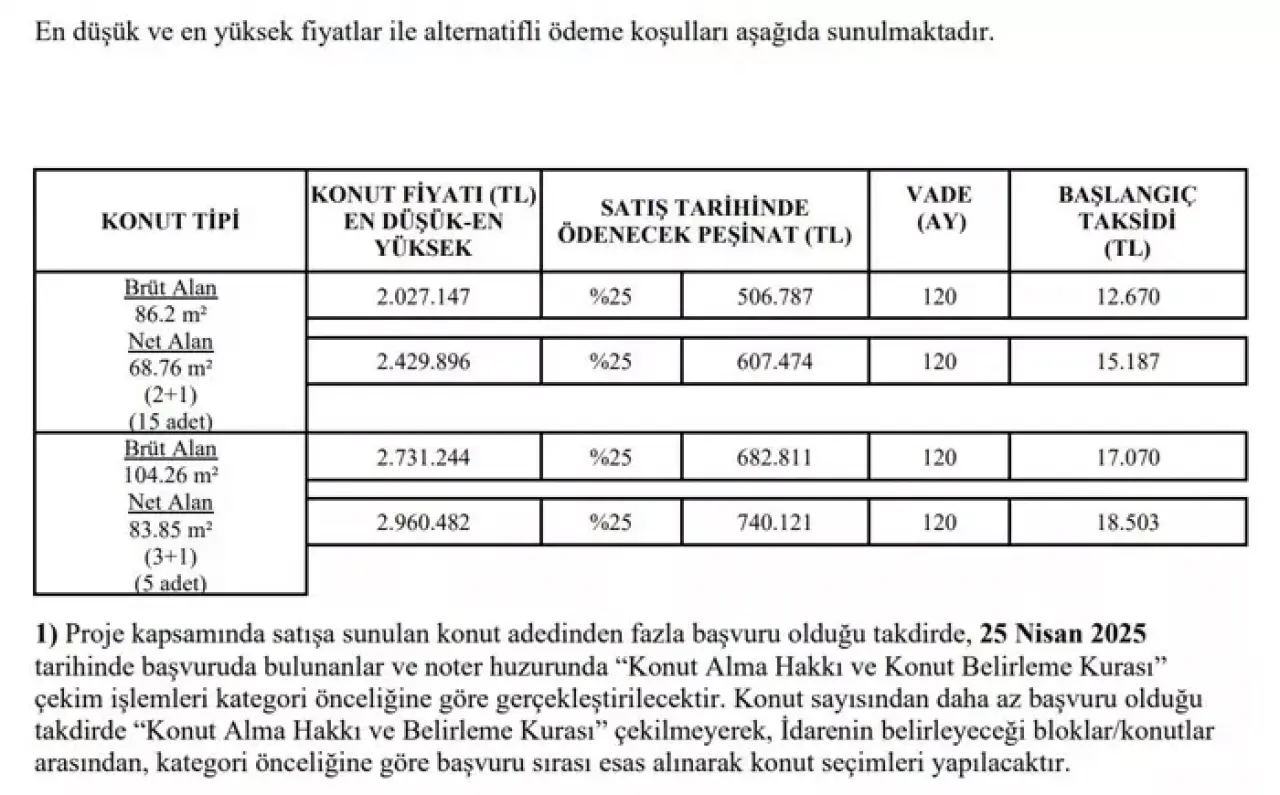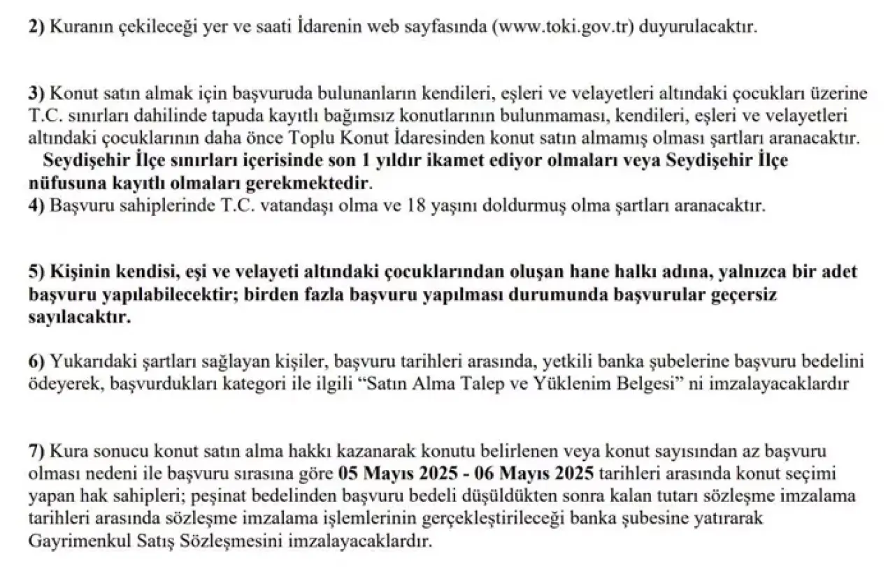 Başvuruya alınacak konut tipleri 2+1 ve 3+1 olarak açıklandı ve kura tarihi 25 Nisan 2025. Sözleşme imzalanacak banka şubesi T. Halk Bankası AŞ. Seydişehir / Konya olarak açıklanırken, asil hak sahipleri sözleşme imzalama tarihleri 05 Mayıs 2025 - 06 Mayıs 2025 ve yedek hak sahipleri sözleşme imzalama tarihleri 14 Mayıs 2025 - 14 Mayıs 2025 olarak duyuruldu. Bu noktada asil hak sahipleri sözleşme imzalama işlemlerini tamamladıktan sonra kalan konutlar için olduğu aktarıldı.