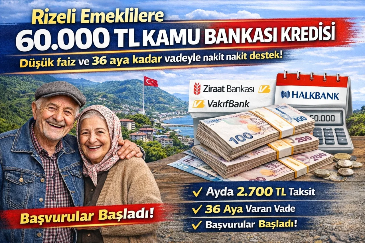Ocak 2026 itibarıyla, Rize’de yaşayan emekliler için kamu bankalarından sevindirici haber geldi. Ziraat Bankası, VakıfBank ve Halkbank, emekli maaş müşterilerine özel 60.000 TL’ye kadar nakit kredi paketi sunacağını duyurdu. Kampanya, düşük faiz oranları ve 36 aya varan esnek vade seçenekleriyle emeklilerin bütçesine destek olmayı amaçlıyor.
