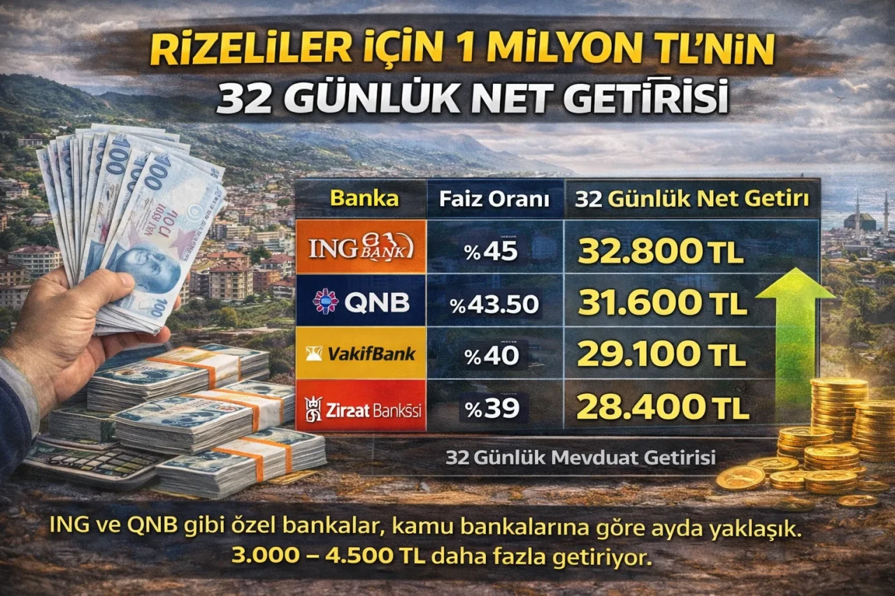 Özellikle 32 günlük vadelerde sunulan “tanışma faizleri” ve özel kampanyalar, Rizeliler için ciddi avantaj sağlıyor. Güncel net getiriler banka banka şu şekilde: