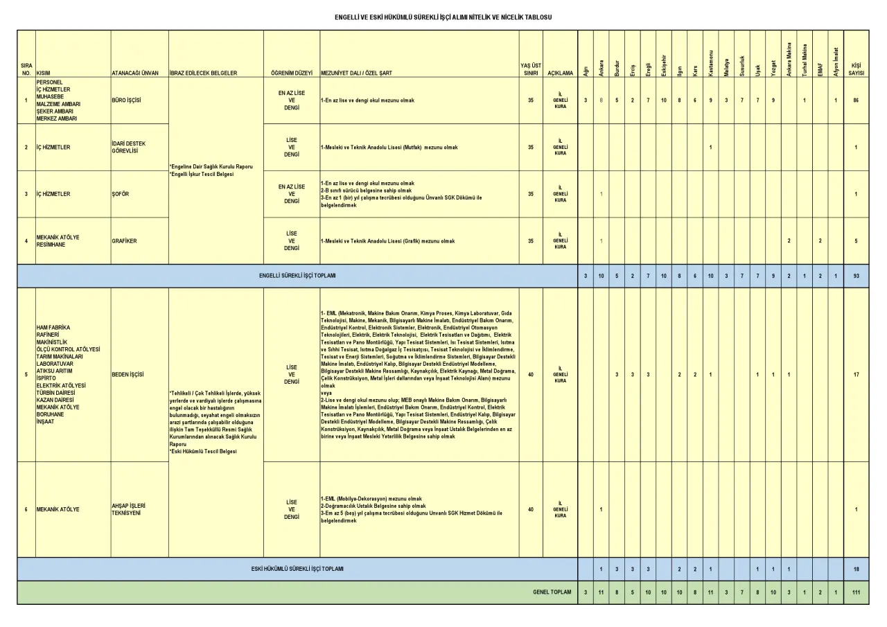 ENGELLİ VE ESKİ HÜKÜMLÜ SÜREKLİ İŞÇİ ALIMI NİTELİK VE NİCELİK TABLOSU