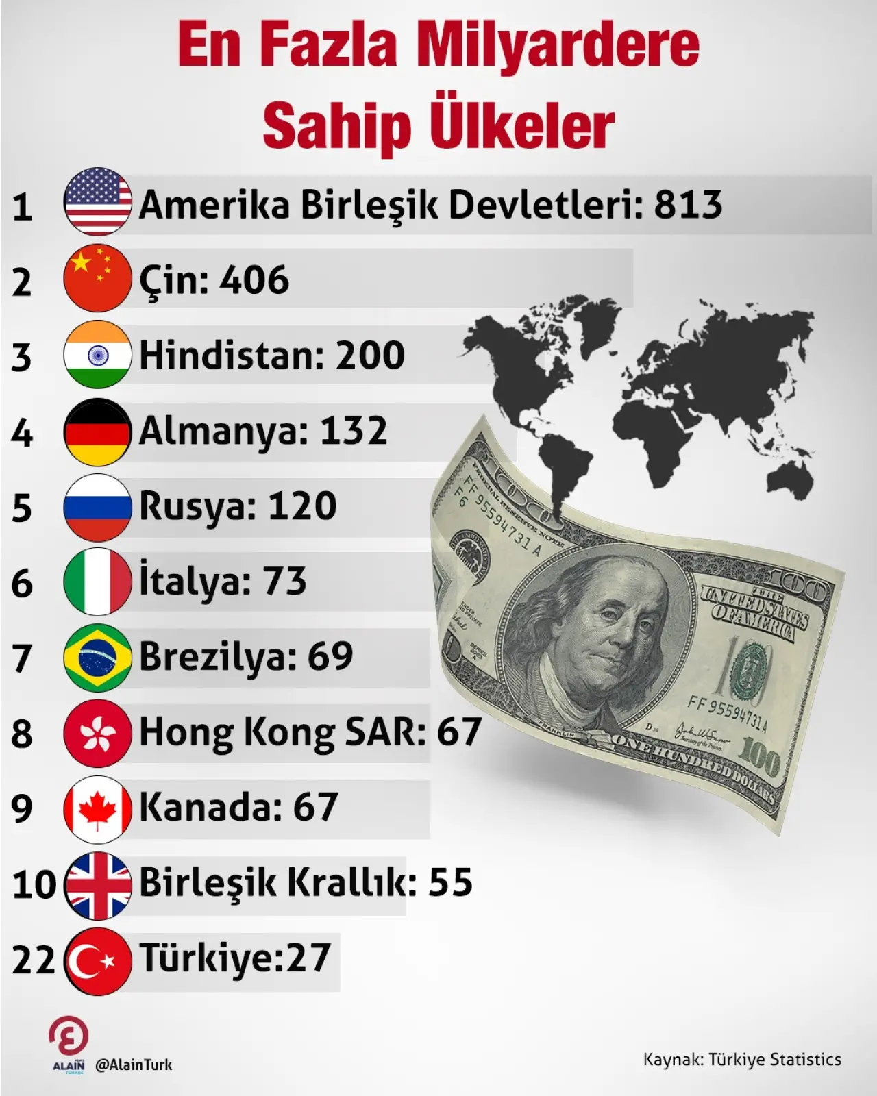 Dünyada en fazla milyardere sahip ülkeler arasında ABD 813, Çin 406 ve Hindistan 200 milyarderle öne çıkıyor. Türkiye, 27 milyarderle 22. sırada yer almakta.