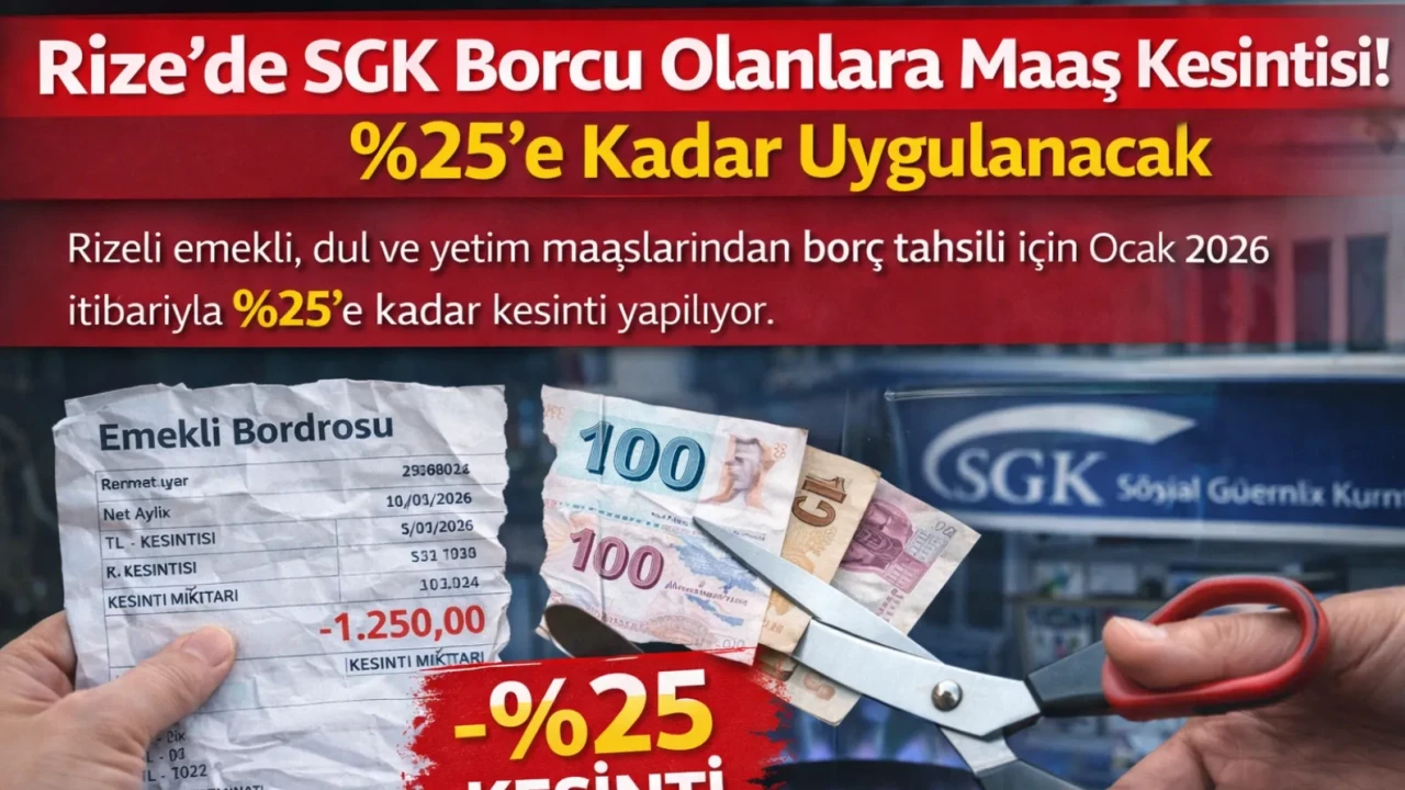 Rize’de emekli, dul ve yetim maaşı alan vatandaşları ilgilendiren yeni bir uygulama Ocak 2026 itibarıyla yürürlüğe girdi. Sosyal Güvenlik Kurumu’na (SGK) borcu bulunan hak sahiplerinin maaşlarından, borcun tahsili amacıyla yüzde 25’e kadar kesinti yapılmaya başlandı. Bu kapsamda prim borçları, genel sağlık sigortası borçları ve idari para cezaları, maaşlardan doğrudan tahsil ediliyor.