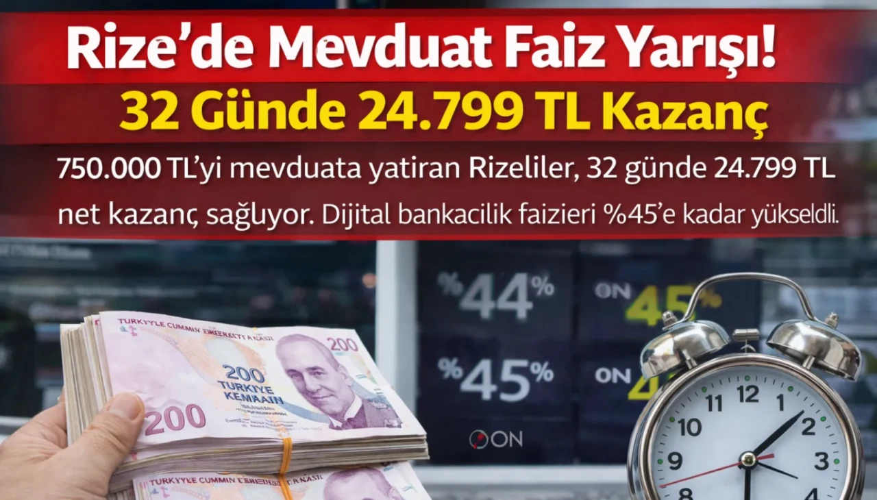 25 Ocak 2026 itibarıyla güncellenen mevduat faiz oranlarına göre, 750.000 TL’lik birikimini 32 gün vadeli mevduata yatıran bir Rizeli yatırımcı, stopaj sonrası net 24.799 TL kazanç elde edebiliyor. Bu tutarın, kısa sürede pasif gelir sağlamak isteyenler için dikkat çeken bir fırsat sunduğu belirtiliyor.