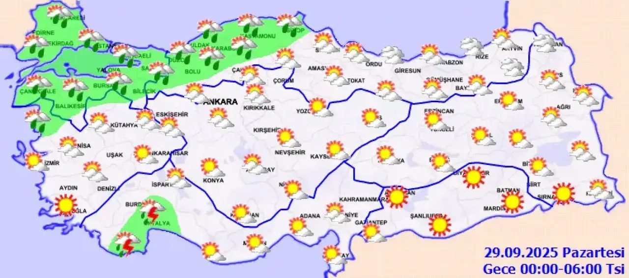 Meteoroloji’den yapılan açıklamada, “Ülkemizin kuzeybatı kesimlerinin parçalı, yer yer çok bulutlu, Antalya çevreleri ile akşam saatlerinden sonra Marmara, Batı Karadeniz ile İzmir'in kuzey ilçelerinin yerel sağanak ve gök gürültülü sağanak yağışlı, diğer yerlerin az bulutlu ve açık geçeceği tahmin ediliyor. Sabah saatlerinde Karadeniz'in iç kesimlerinde pus ve yer yer sis bekleniyor” ifadeleri yer aldı.