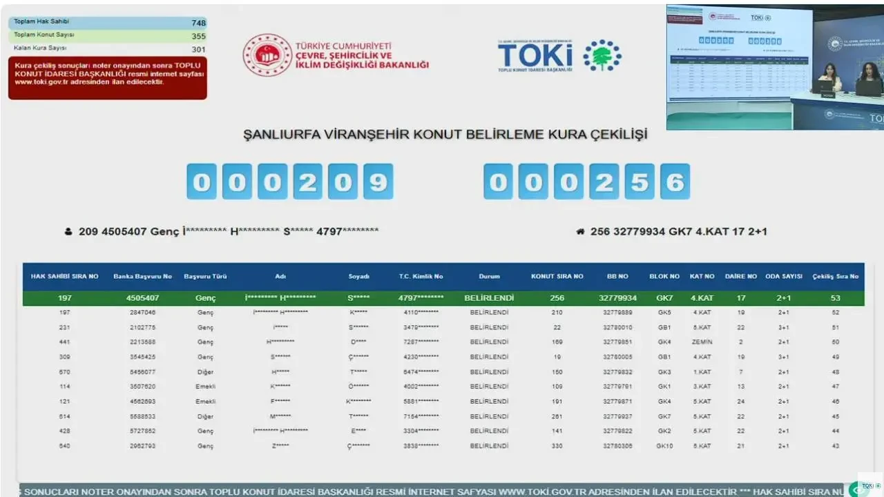 Kura sonuçları ise şimdiden merakla araştırılıyor. 355 adet 2+1 ve 3+1 dairenin bulunduğu, 748 başvuru arasından TOKİ Şanlıurfa Viranşehir konut belirleme kura çekilişi sonuçları belli olmuş oldu.