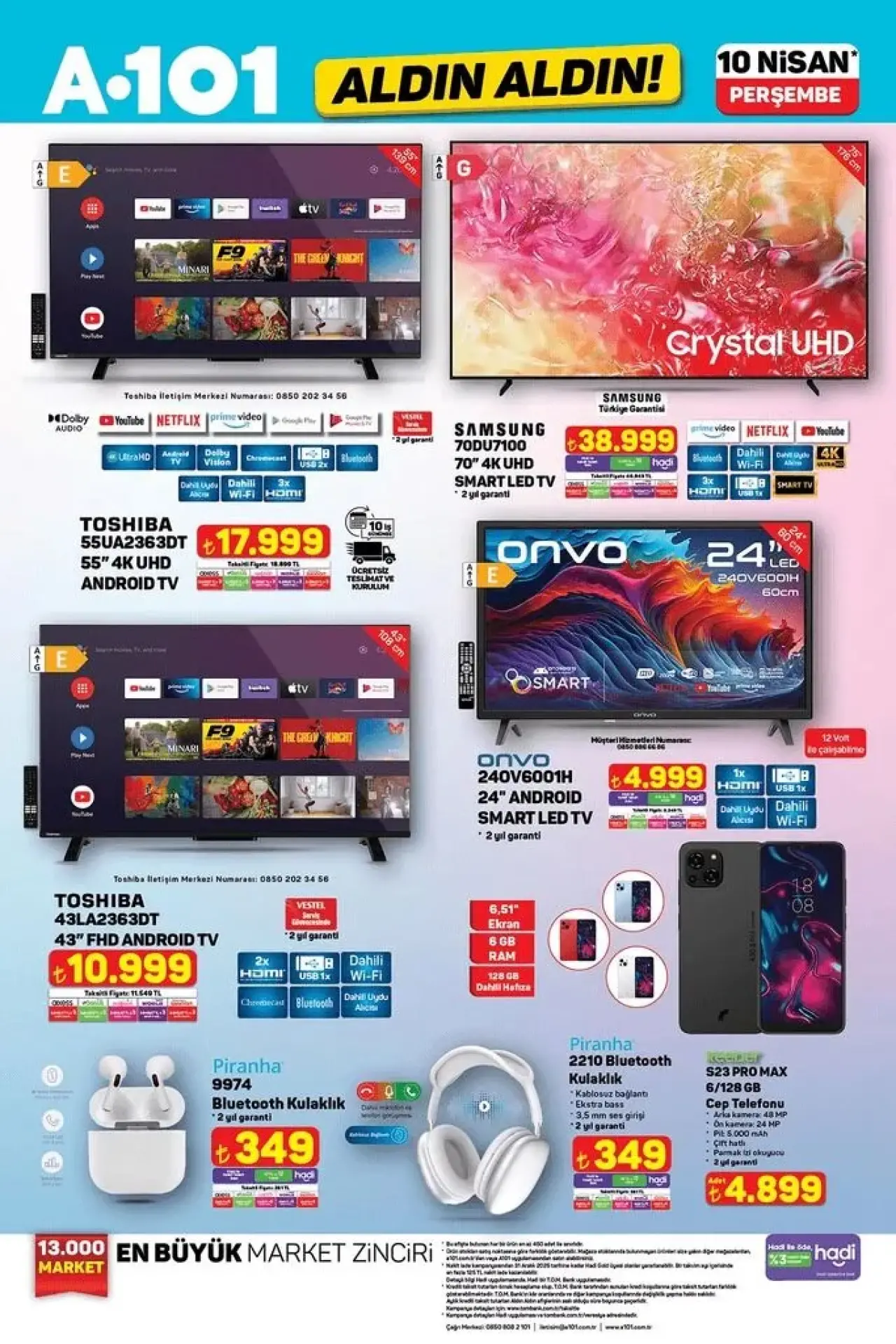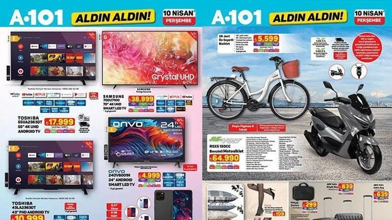 A101’in yeni kampanyasında televizyon ve cep telefonları gibi teknolojik ürünler de yer alıyor. Toshiba 55 inç 4K UHD Android TV, 17.999 TL fiyatıyla dikkat çekerken, Samsung 70 inç 4K UHD Smart LED TV ise 38.999 TL'ye satışa sunulacak. Ayrıca, Reeder S23 Pro Max 6/128 GB cep telefonu 4.899 TL'ye alıcı bulacak.