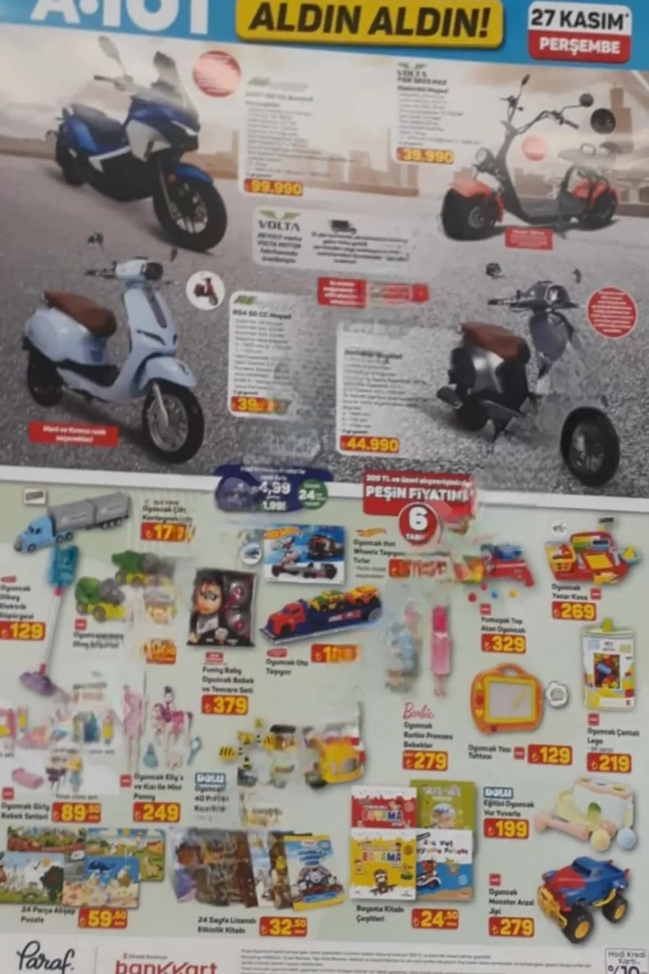 Kiwi Elektrikli Cezve 499 TL. Vestel Saç Düzleştirici İyonik Tarak 699 TL. Arzum Cyclone Süpürge 3,999 TL. Arzum Mistost Tost Makinesi 1.999 TL. A101 27 Kasım 2025 sayfalarında bu hafta indirim listesine en fazla ilgi görecek Benzinli Motosiklet ve Elektrikli Bisikletler grubunda yine harika fırsatlar var; Volta EV1 Elektrikli Araç 229.990 TL.