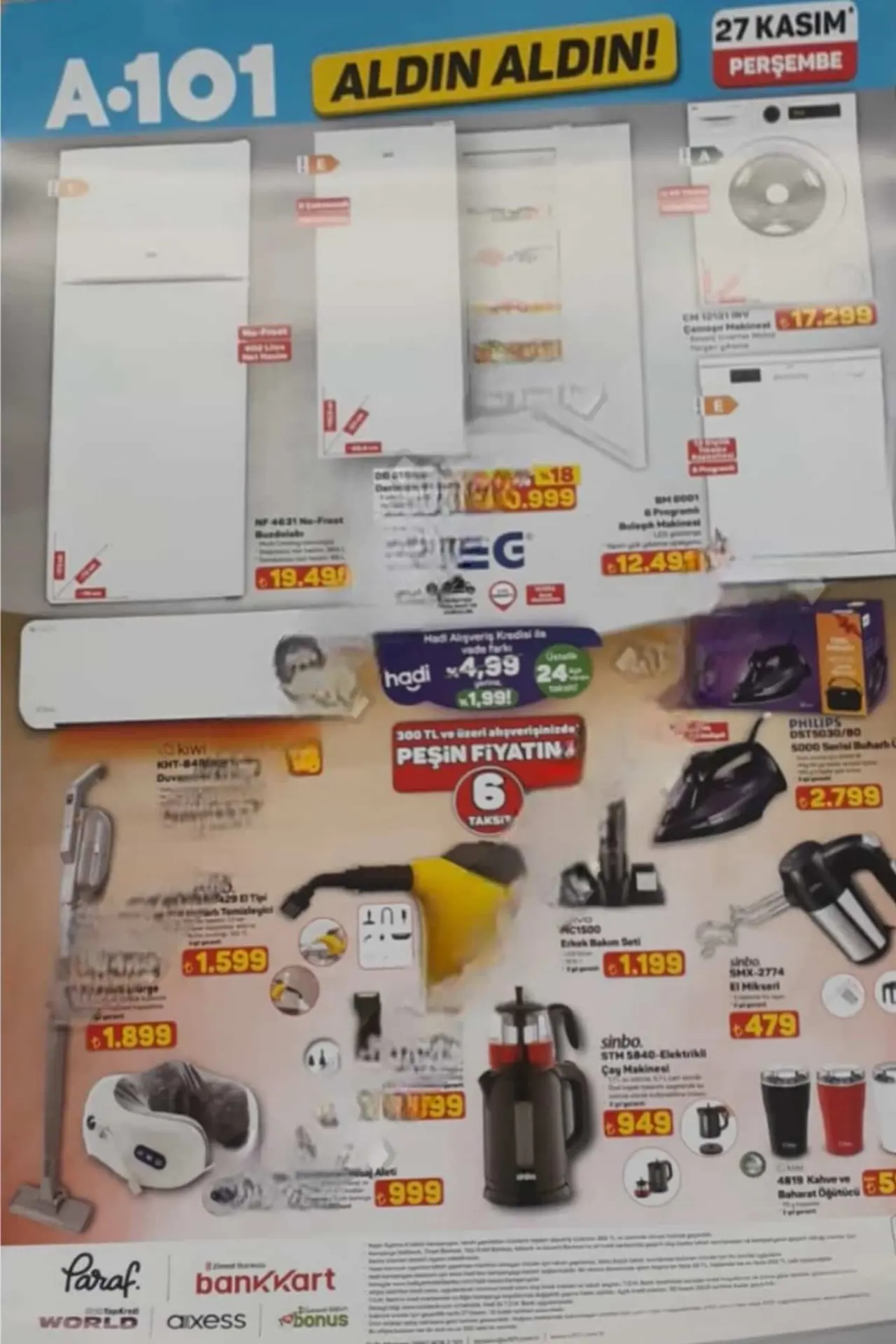 A101’de bu hafta kampanya listesinde Beyaz Eşya grubunda 27 Kasım 2025 A101 Aktüel Katalog içeriğinde yer almış fırsat ürünleri ise; SEG markası ile 2 yıl garantili olan 10 iş gününde Ücretsiz teslimat ve kurulum peşin fiyatına kredi kartına 3 taksit imkanı ile Led göstergeli, çocuk kilidi, 6 program, hızlı yıkama, 12 kişilik yıkama kapasiteli SEG Bulaşık Makinesi 10,499 TL. Çift kapılı 451 litre iç hacime sahip olan SEG No-Frost Buzdolabı 19,999 TL.